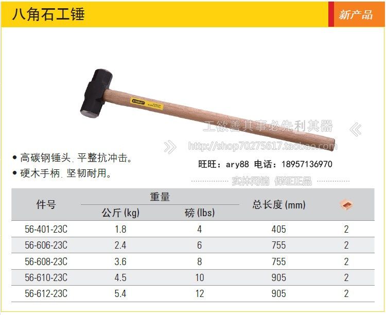 史丹利SD硬木柄八角石工锤56-401/606/608/610/612-23C铁锤榔头