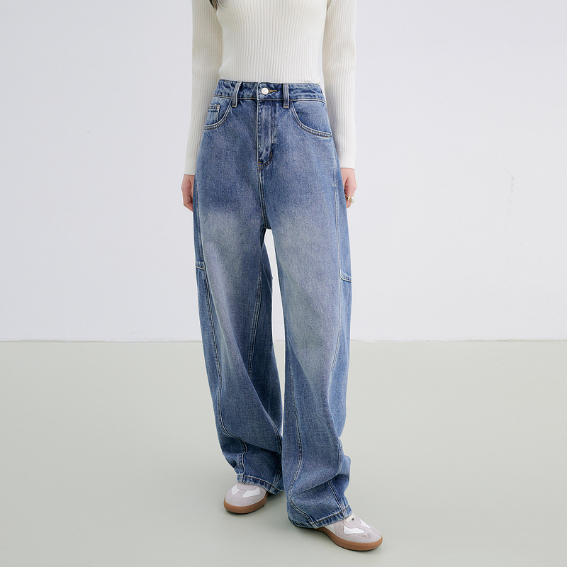 Basic House/百家好垂感高腰牛仔弯刀裤女秋季新款复古做旧阔腿裤