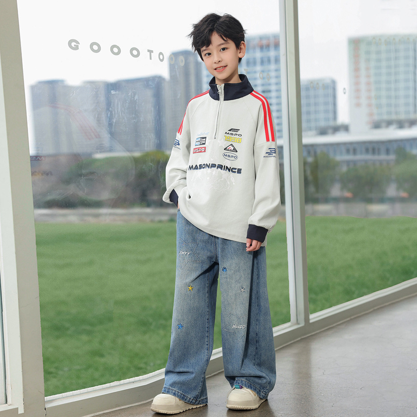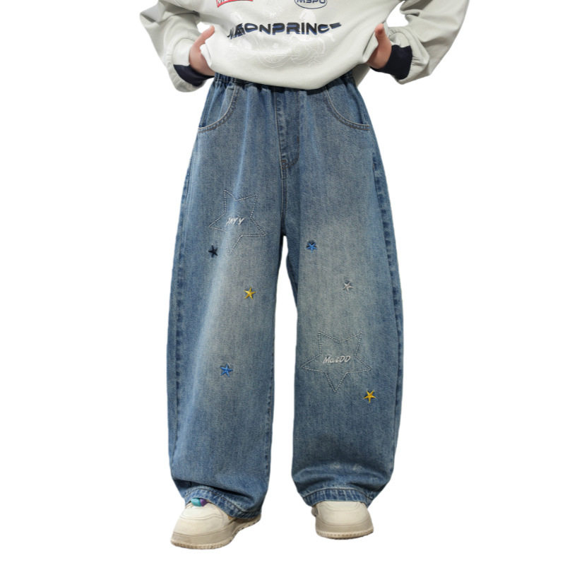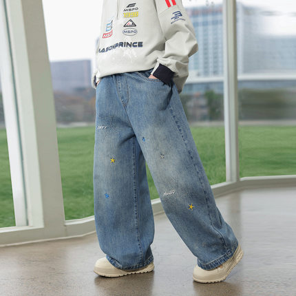 男童中大童2026春季新款百搭软牛仔裤熊猫圆圆星星长裤垂感阔腿裤