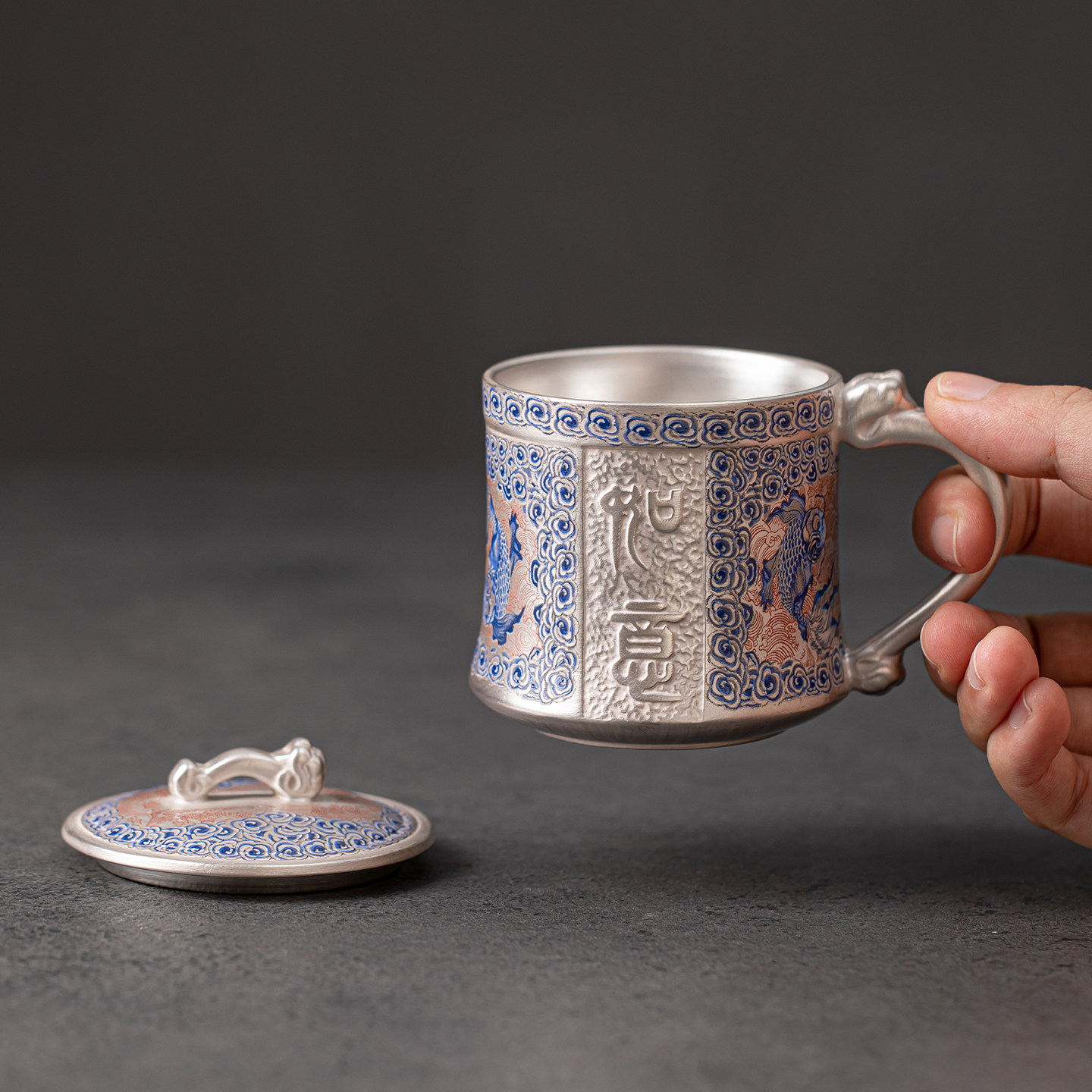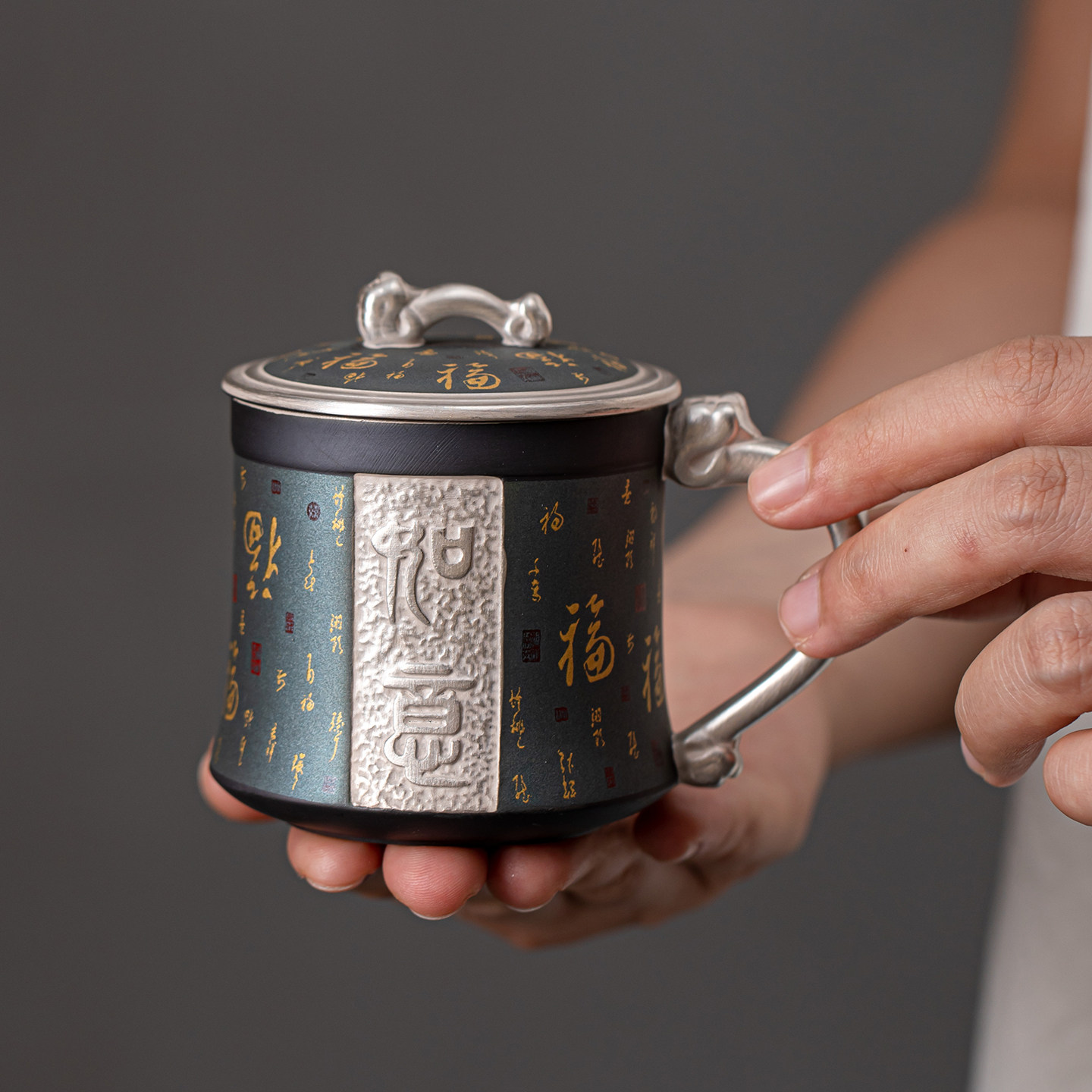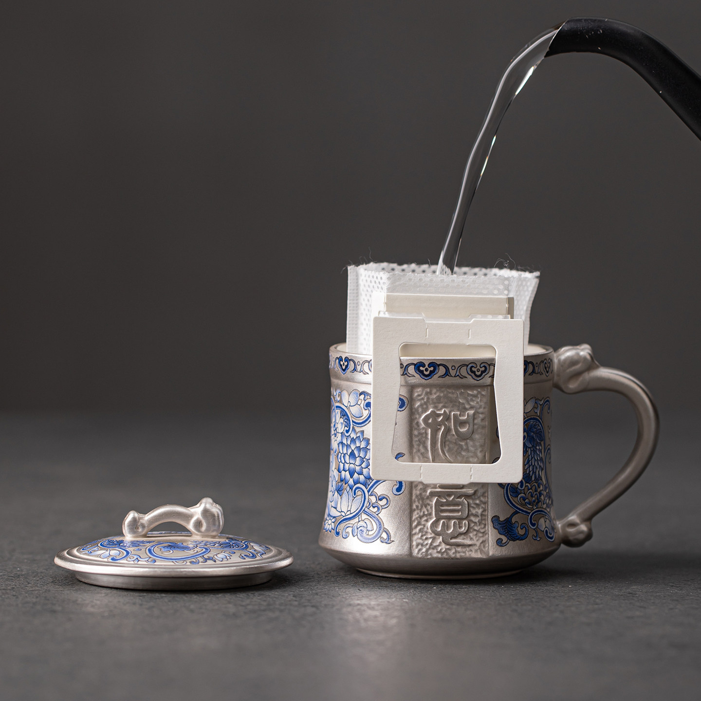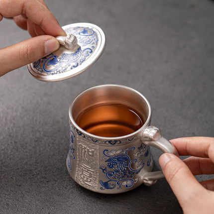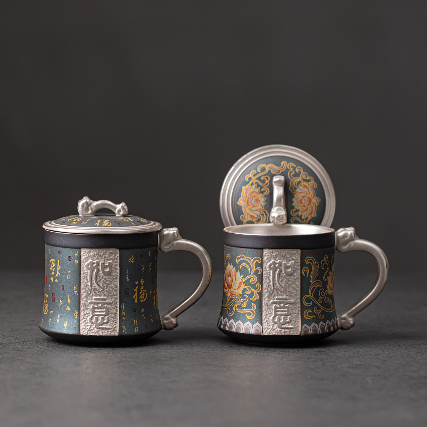 复古中式鎏银陶瓷杯子轻奢主人杯茶杯带盖水杯小号文创咖啡杯礼品
