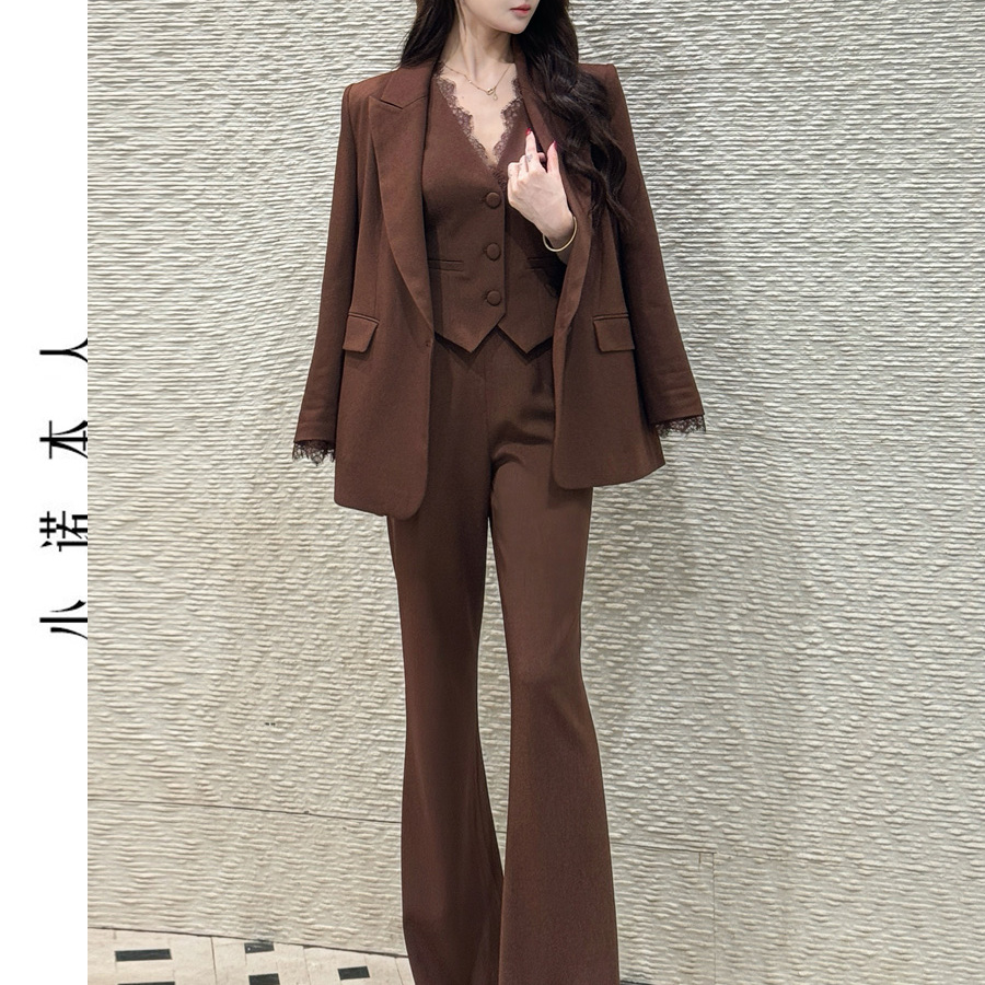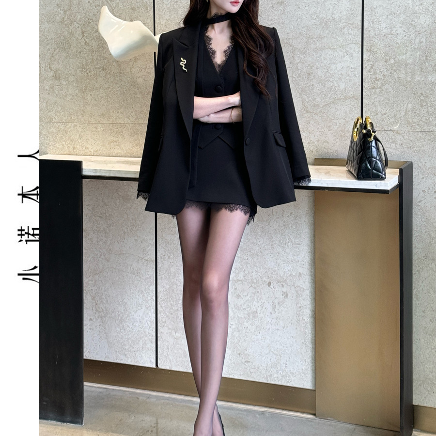 小诺本人轻职风西装套装小众蕾丝拼接马甲高腰包臀裙三件套251806