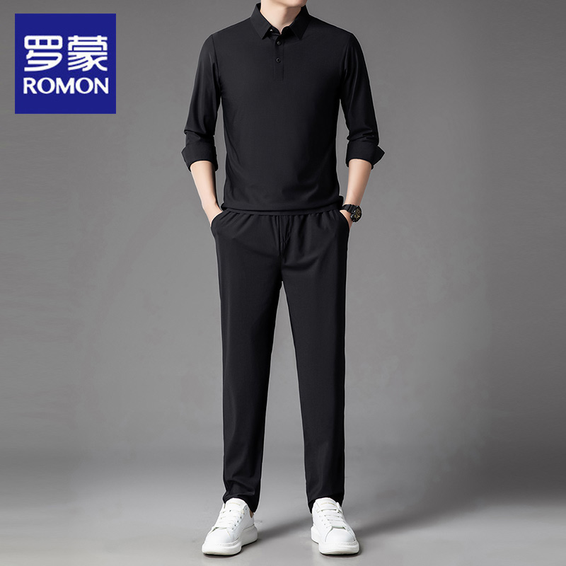 罗蒙POLO衫男长袖长裤套装2024春秋季新款商务休闲无痕秋装上衣裤