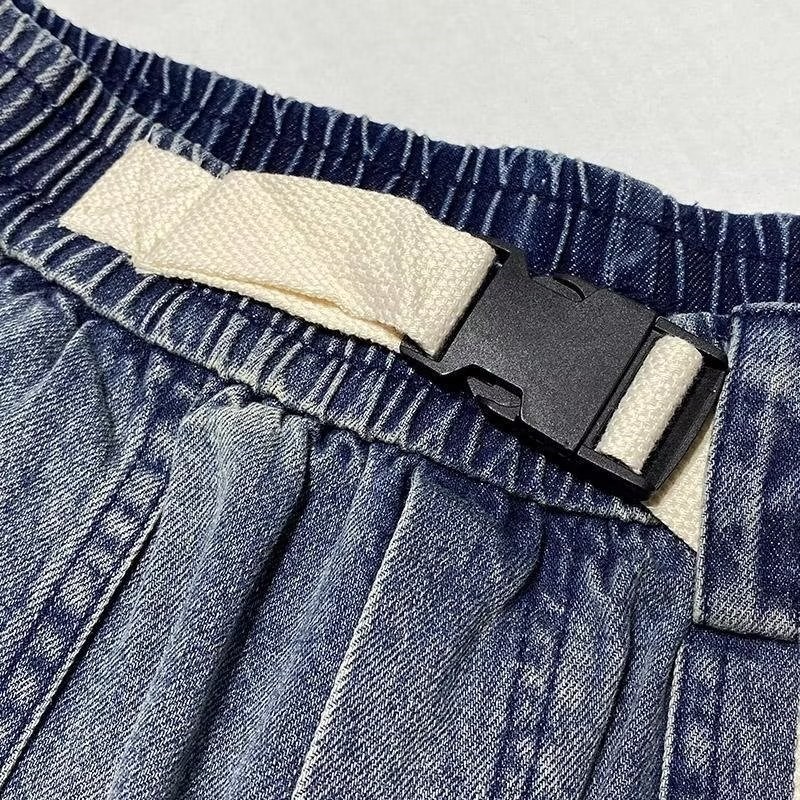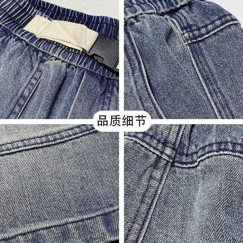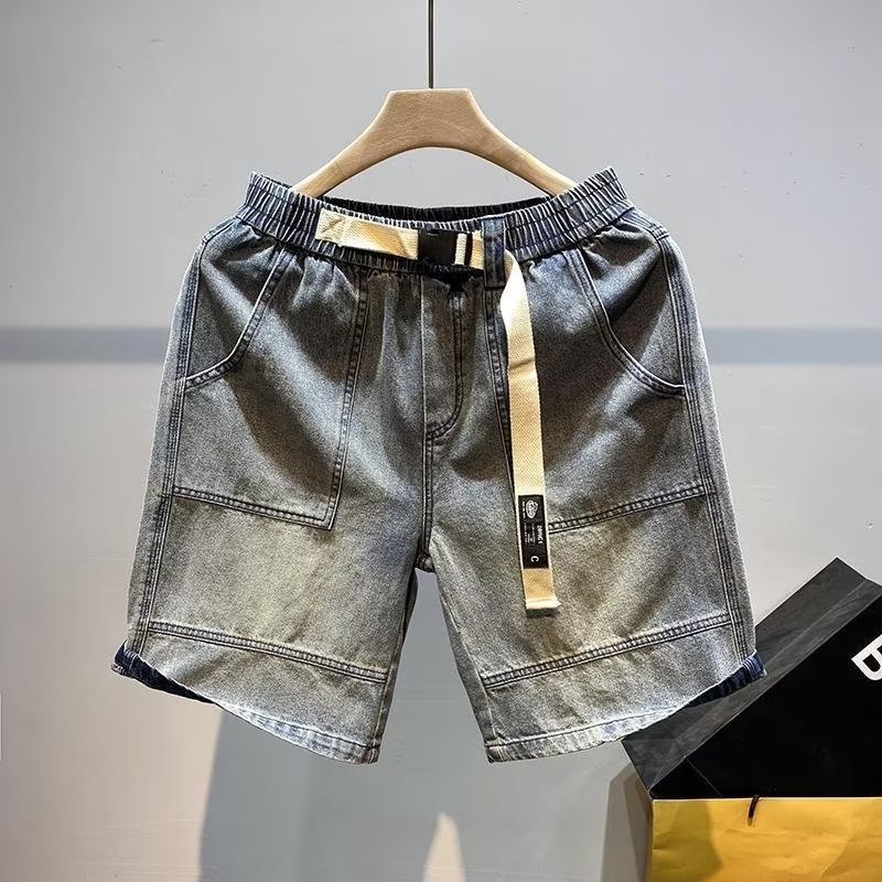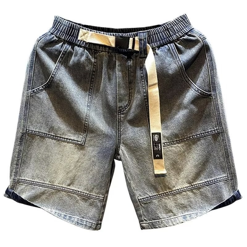 夏季薄款美式牛仔短裤男士宽松直筒工装中裤拼接复古大口袋五分裤
