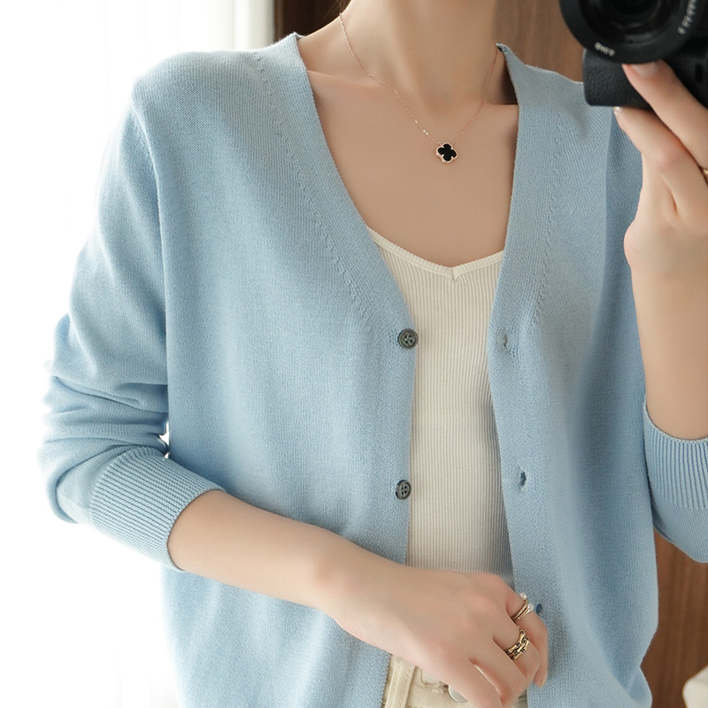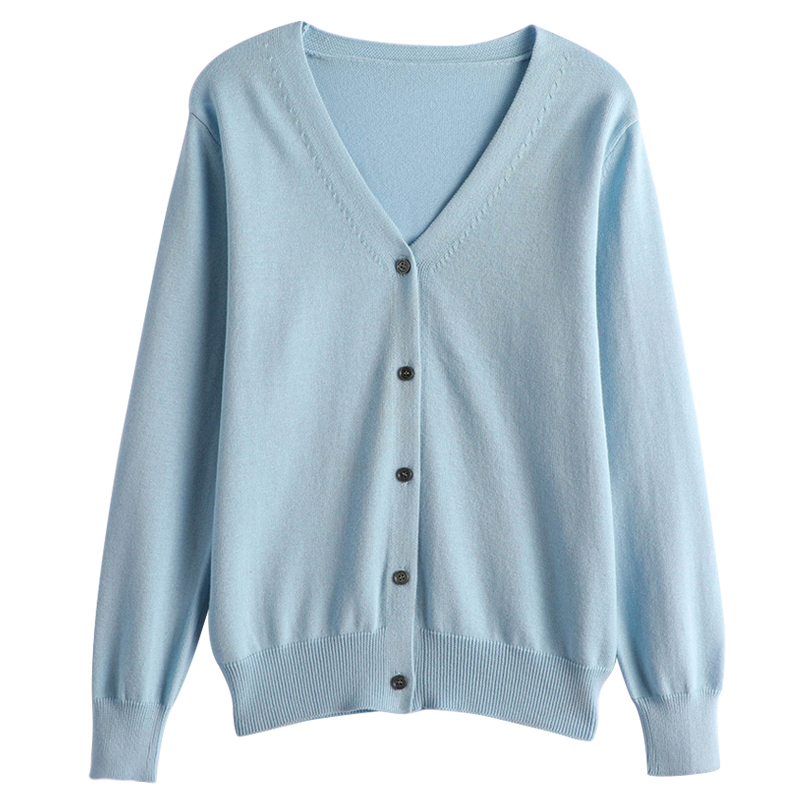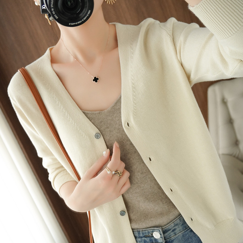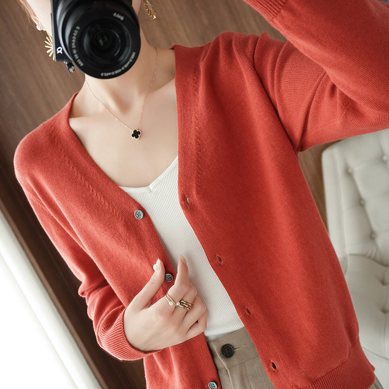 100%纯棉线长袖针织开衫女V领外套线衫宽松短款纯色简约全棉外搭