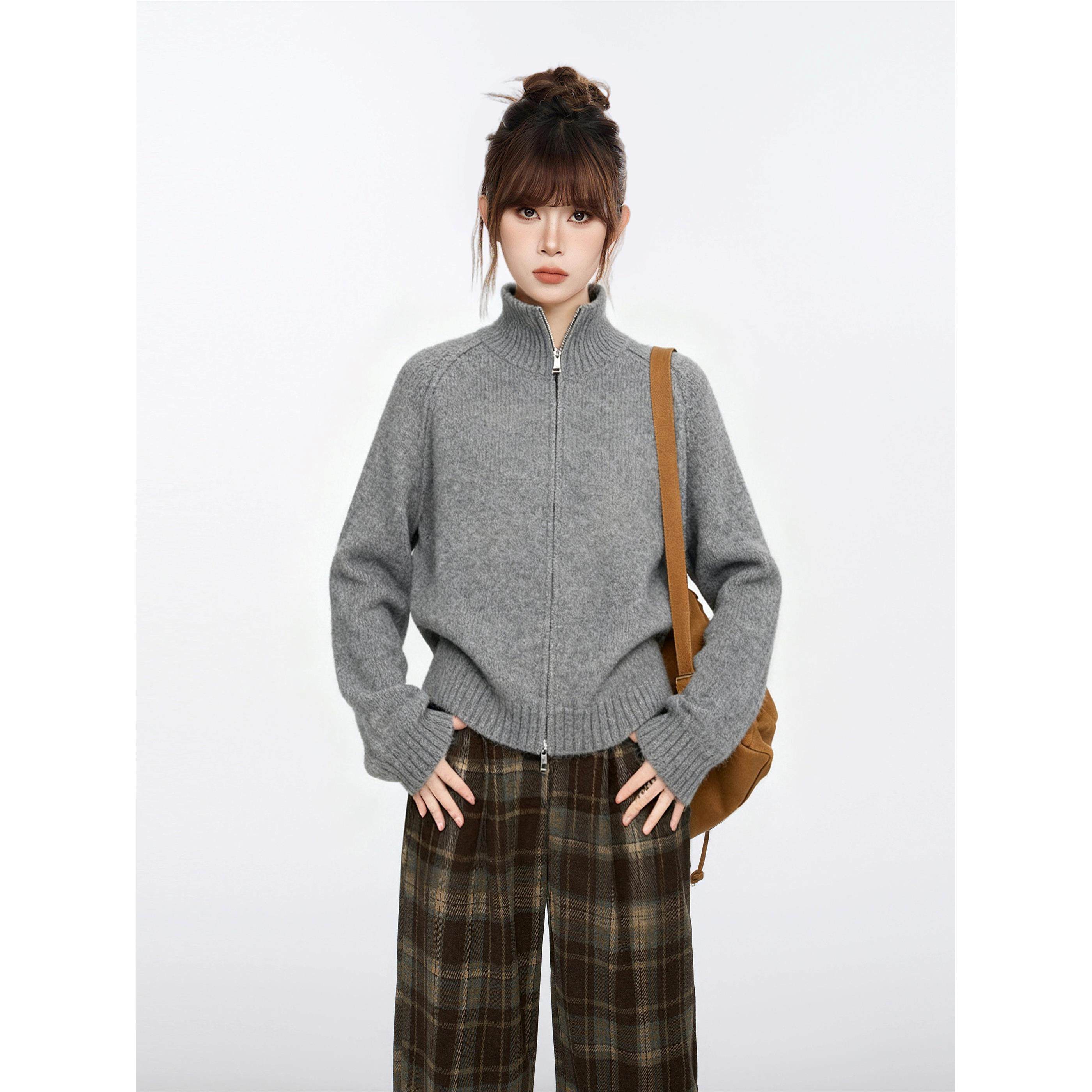 灰色立领高领拉炼毛衣外套女秋冬季加厚宽松慵懒短款针织开衫上衣