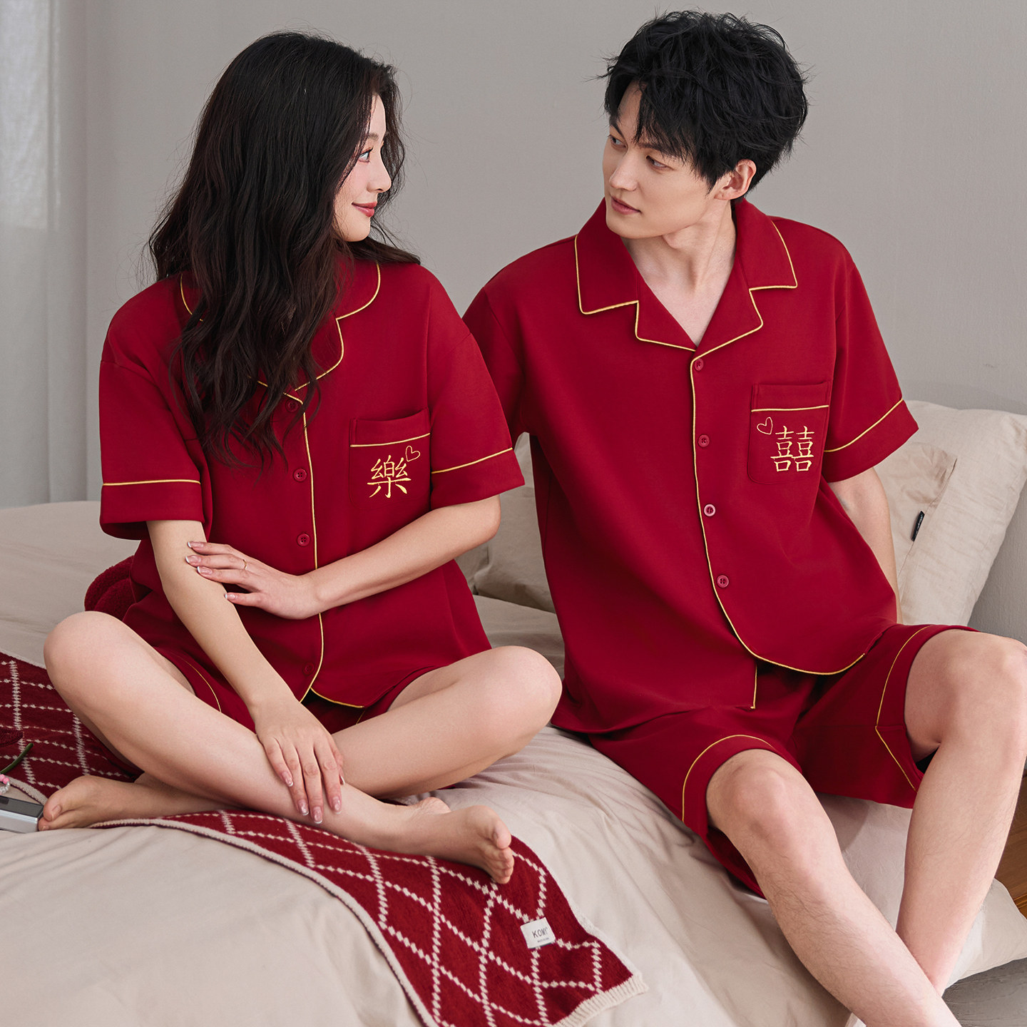 情侣睡衣夏季纯棉短袖翻领红色新婚结婚男女套装240斤300斤6XL7XL