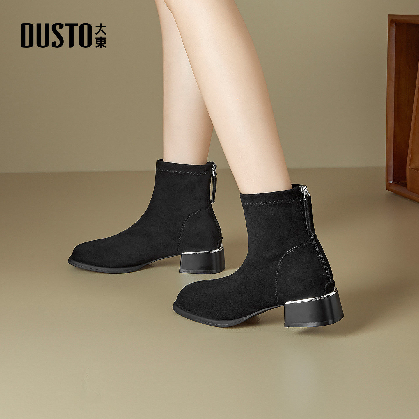 大东dd高跟短靴女2025冬季新款女靴妈妈鞋方头法式绒面裸靴瘦瘦靴