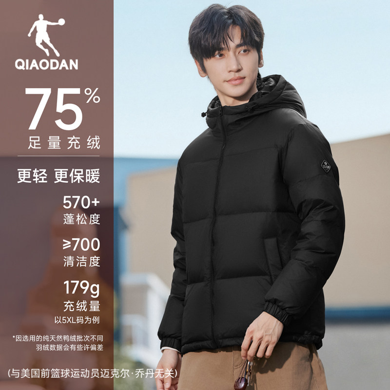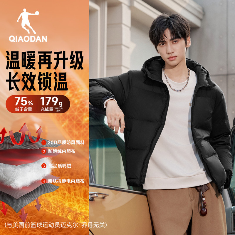 {抗静电}乔丹轻薄羽绒服男连帽2025冬季新款防风加厚夹克外套装黑