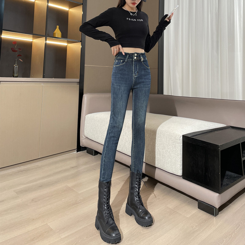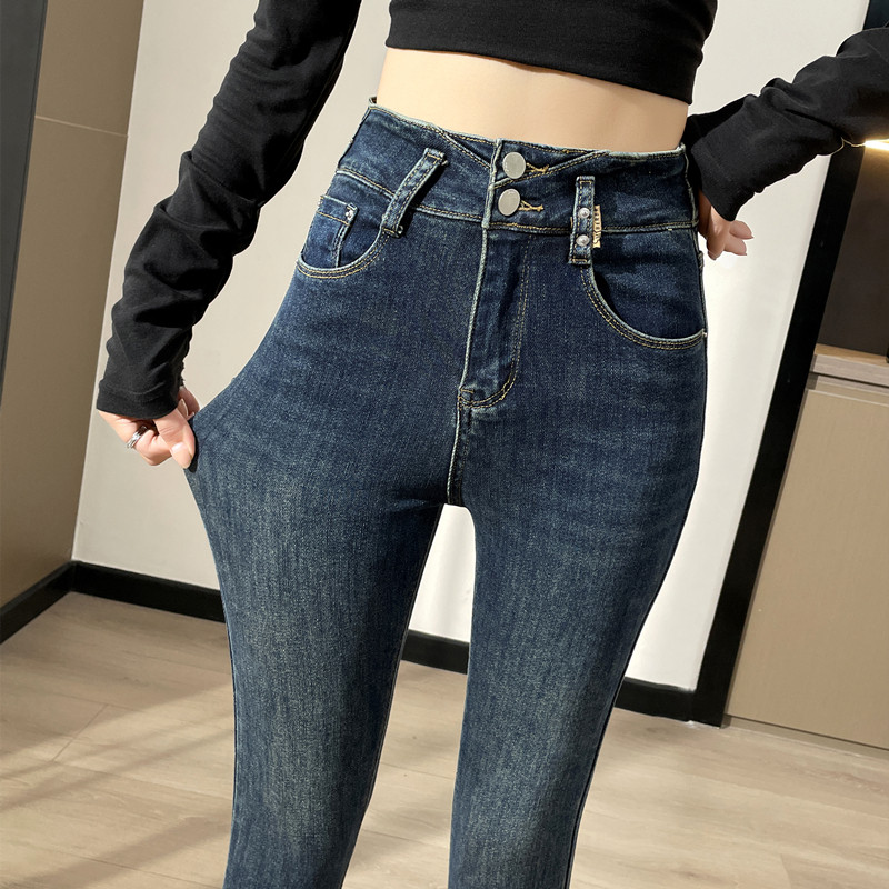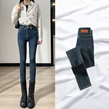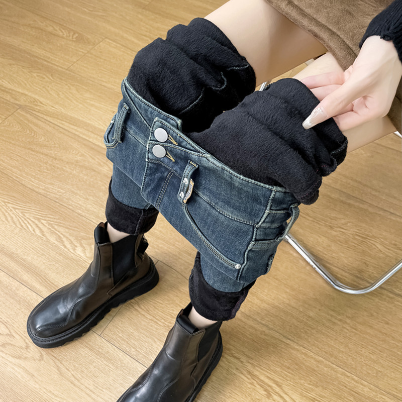 复古蓝加绒牛仔裤女小脚裤高腰