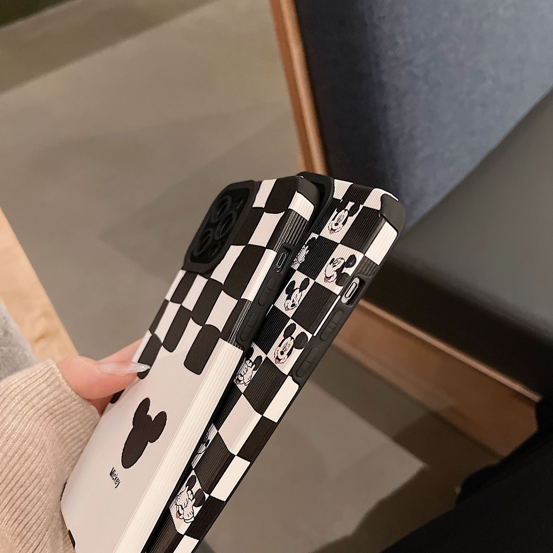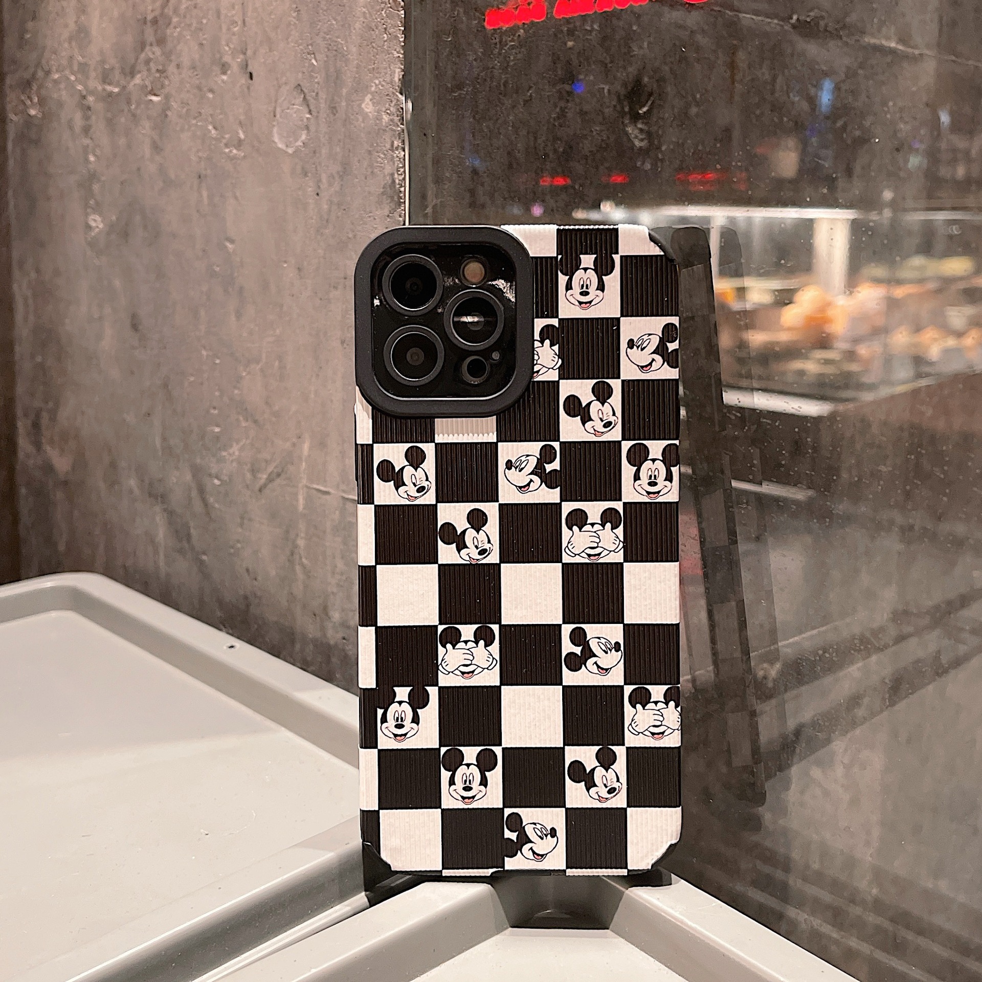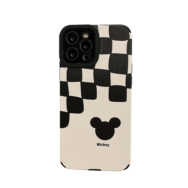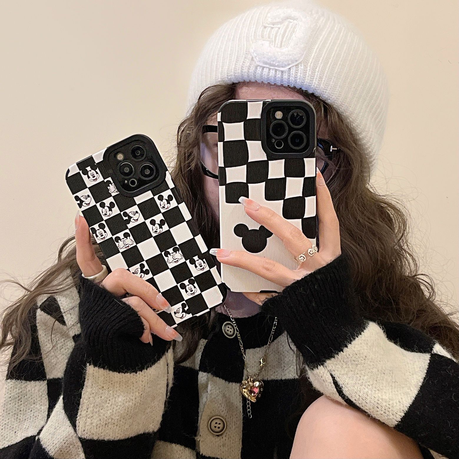 26日韩格子米奇贴皮竖纹适用苹果11手机壳iphone13黑白棋盘软套
