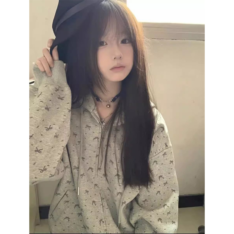 韩系碎花连帽卫衣外套女秋冬季加绒加厚开衫美式高街复古棒球服潮