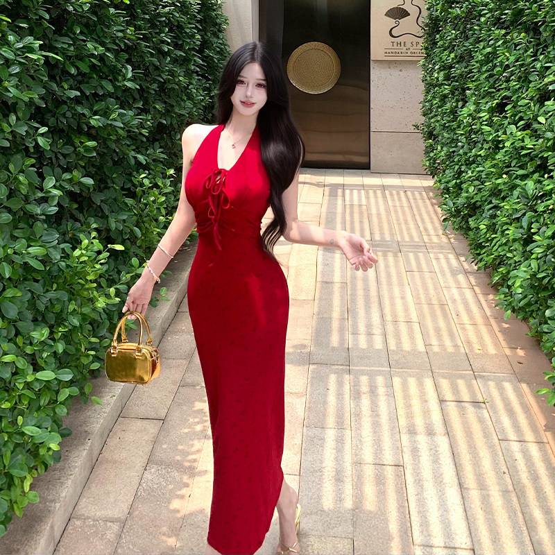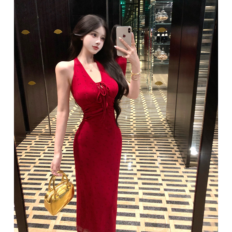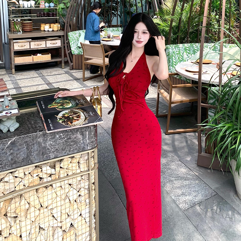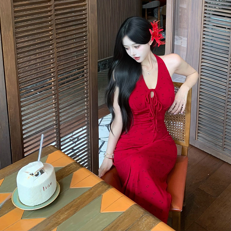 适合150cm小个子春装显高加小码女装碎花挂脖连衣裙女v领收腰长裙