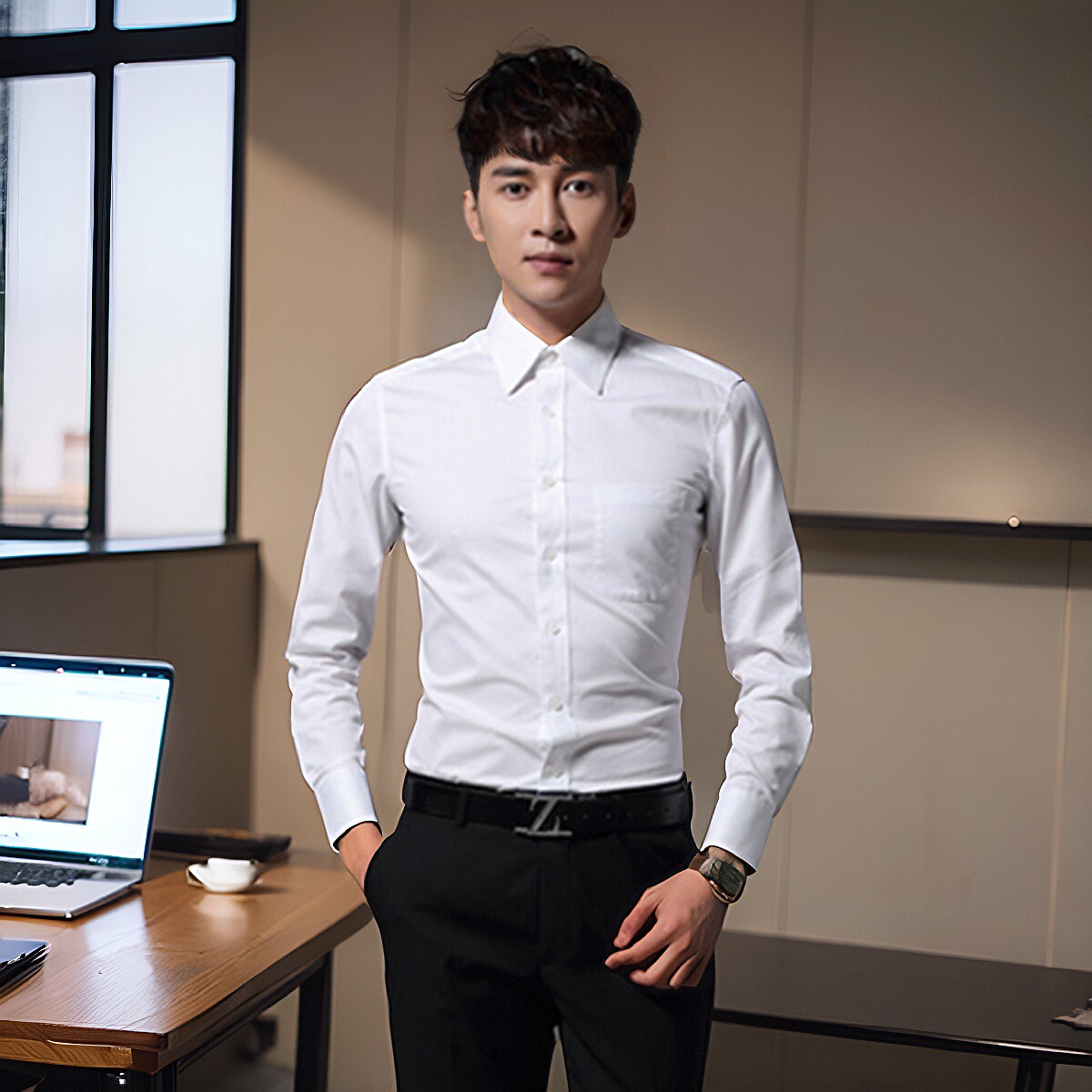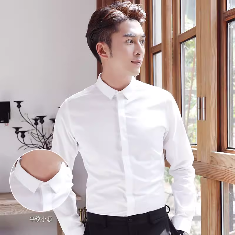 G2000衬衫男长袖小领修身无口袋白色蓝襯衫slim fit 衬衣免烫