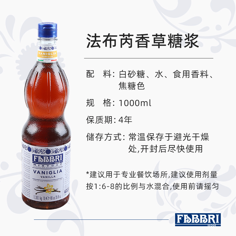 fabbri法布芮香草糖浆1L 意大利进口咖啡馆奶茶店用调味果糖