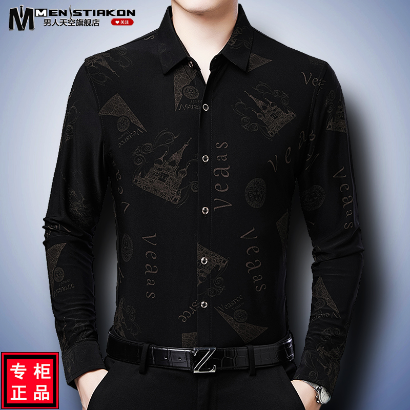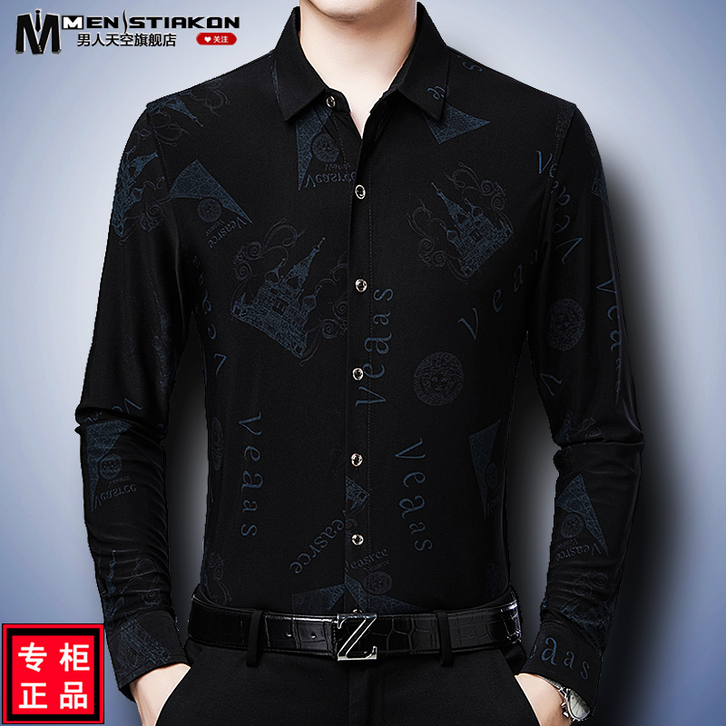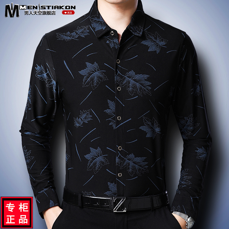 秋季中年男土衬衫长袖花衬衣弹力宽松爸爸装加绒上衣男中老年秋冬