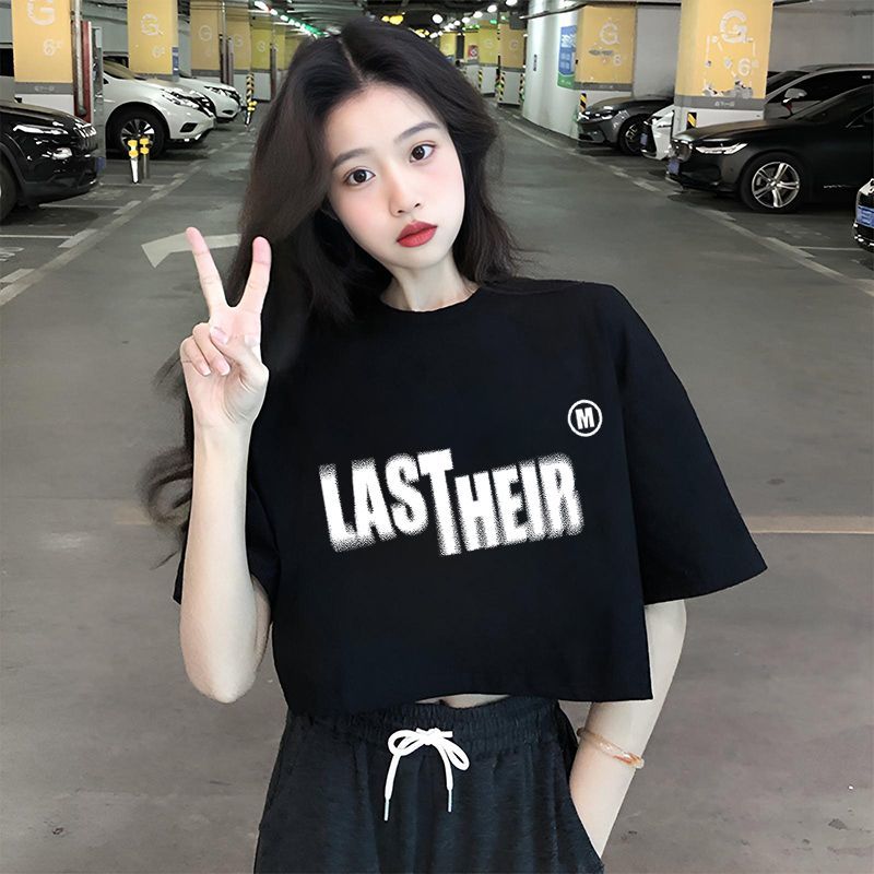 宽松黑色圆领百搭字母短袖t恤女2025年新款夏季短款体桖纯棉上衣