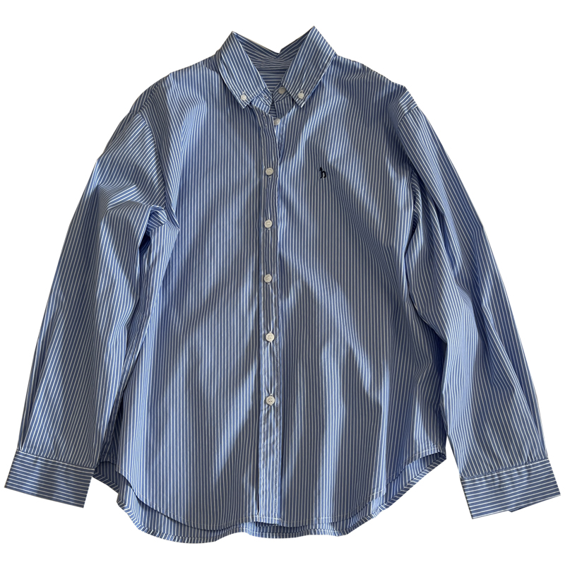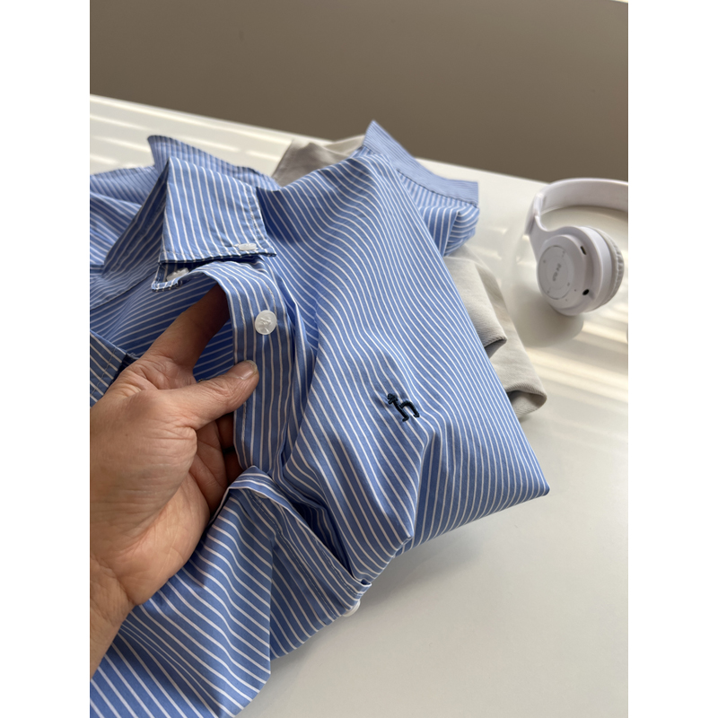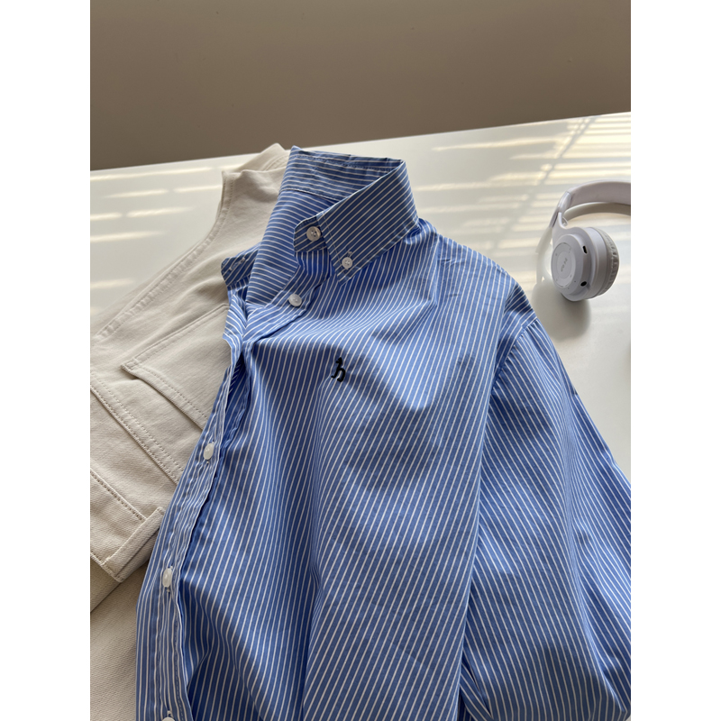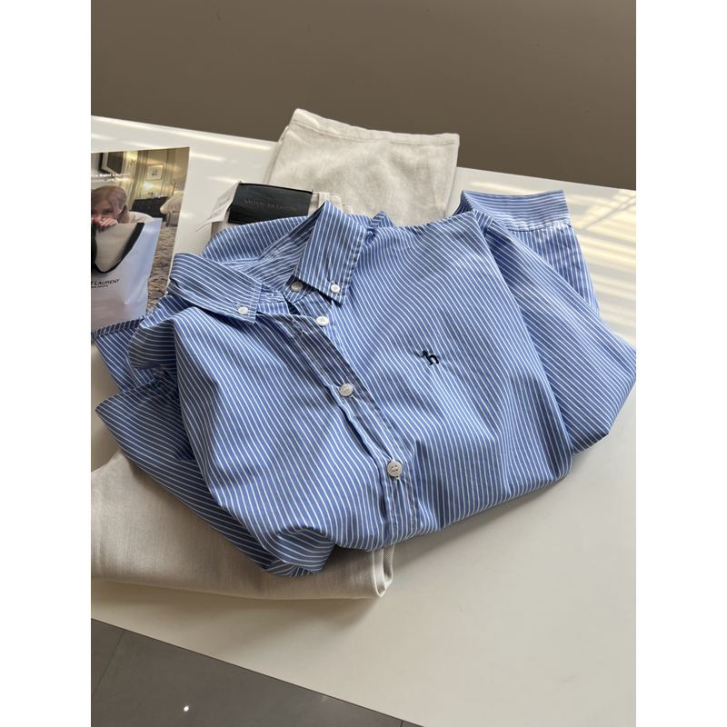 时髦蓝色竖条纹长袖衬衫女宽松春