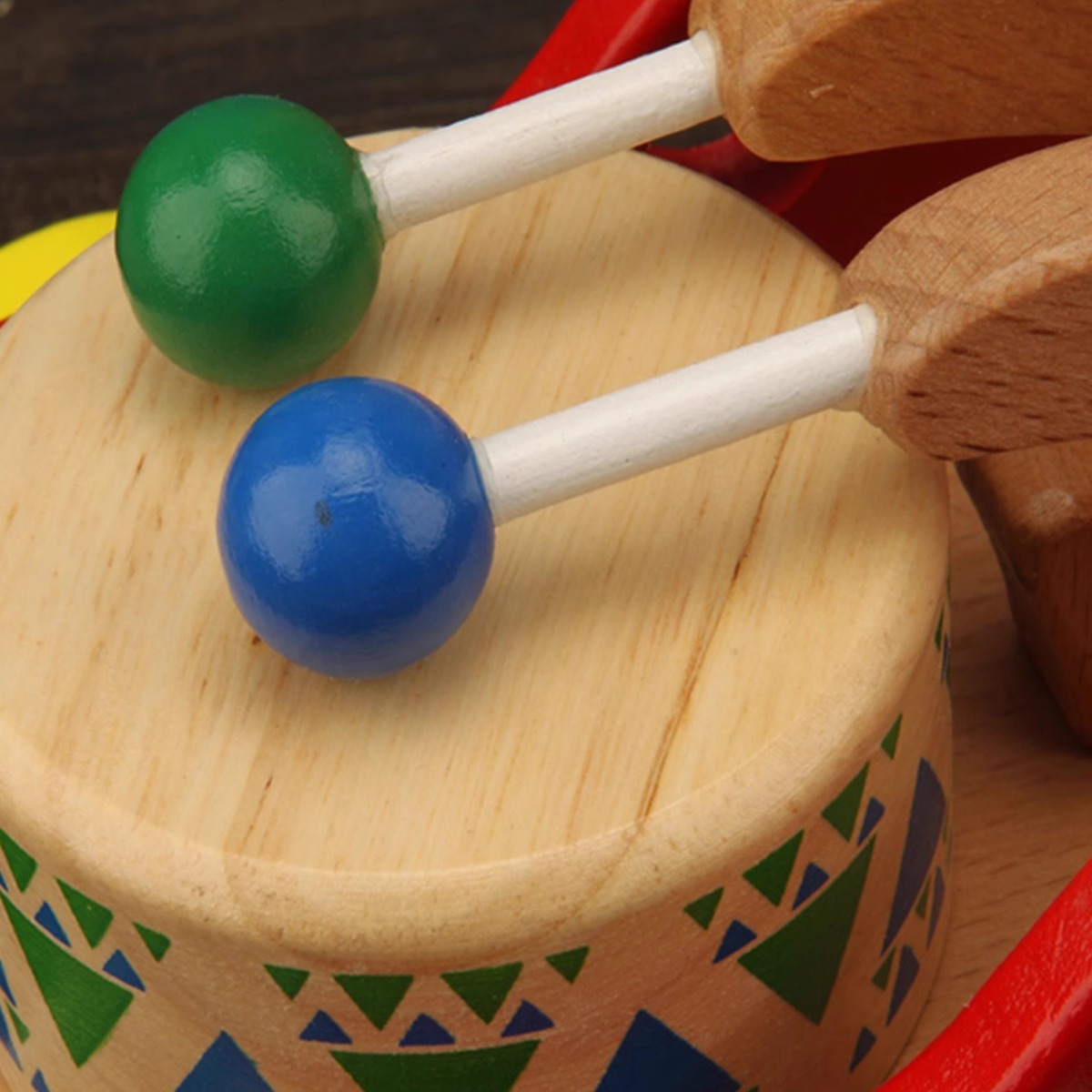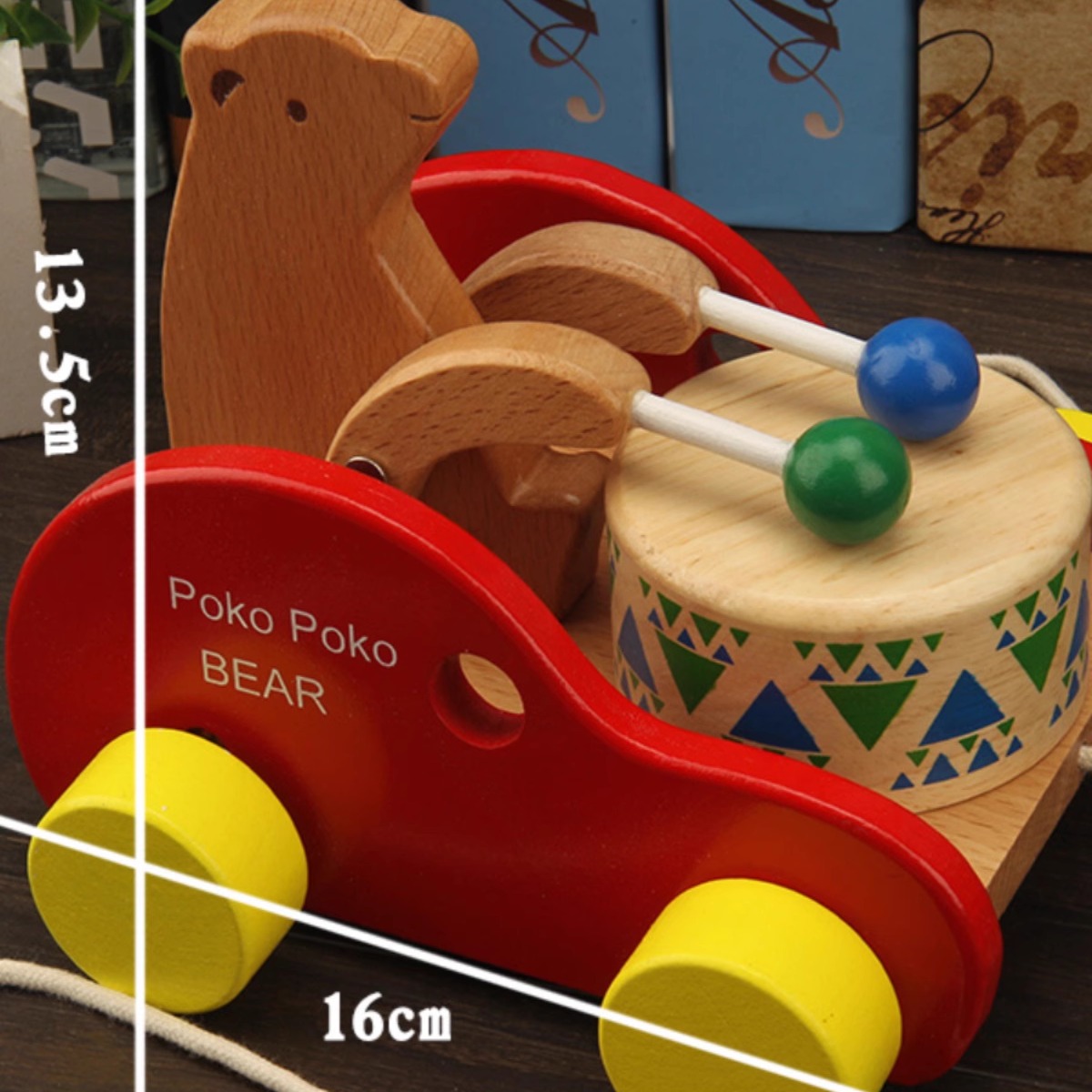 幼儿拖拉榉木小熊敲鼓车学步牵引绳拉拉车1-3岁早教爬行益智玩具