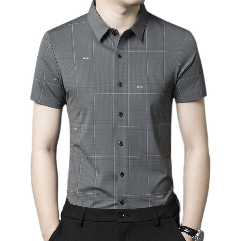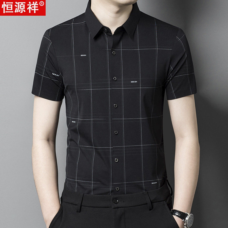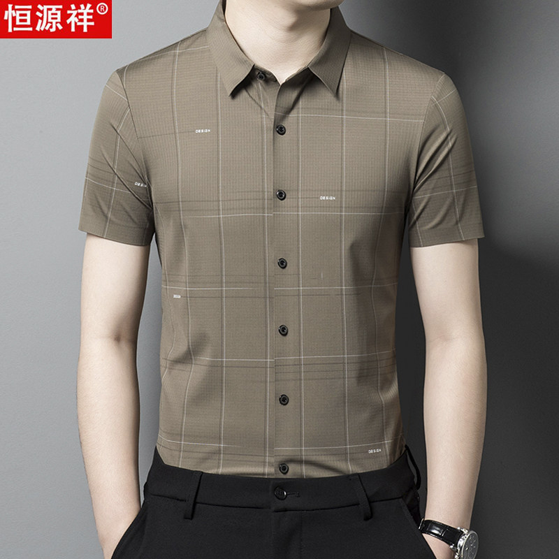 恒源祥桑蚕丝格子短袖衬衫中年男士商务休闲夏季薄款冰丝衬衣免烫