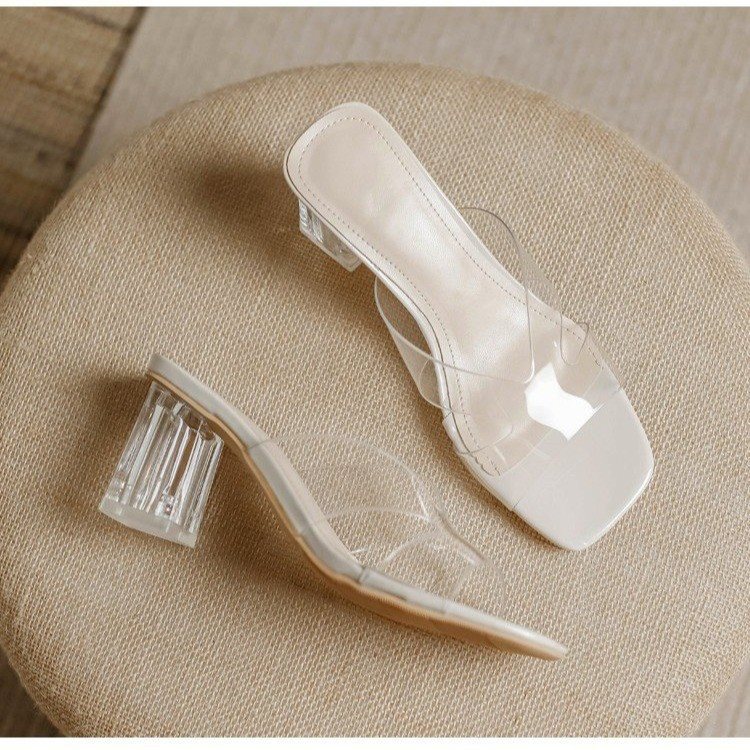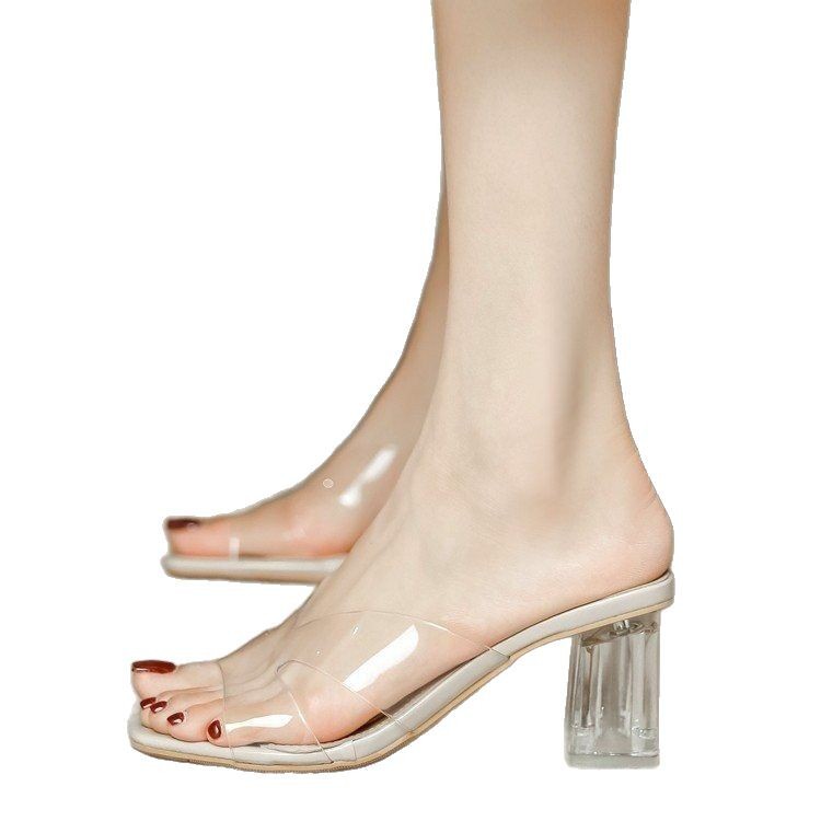 粗跟拖鞋女夏外穿2025年新款凉鞋时尚中跟方头水晶透明一字带凉