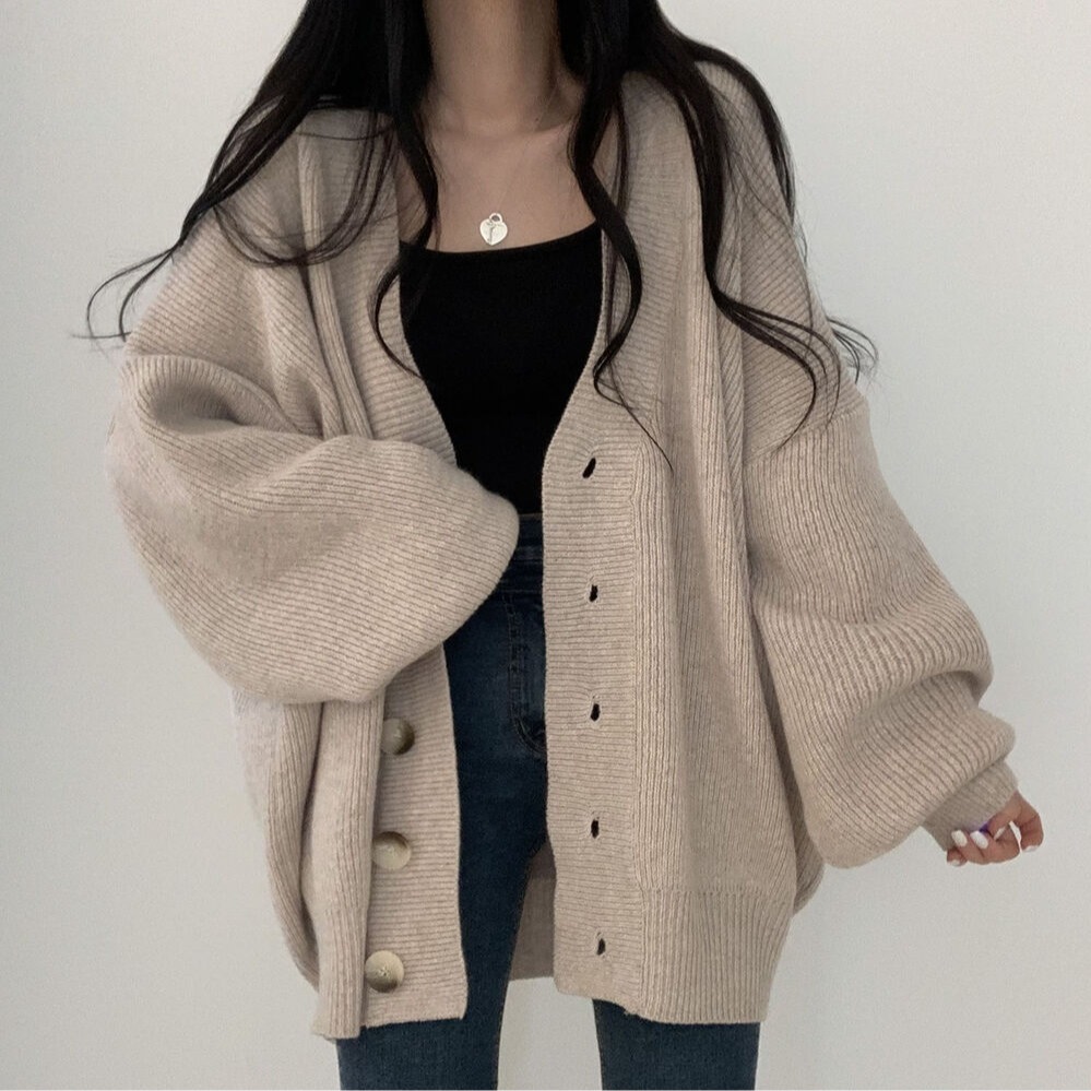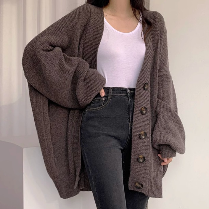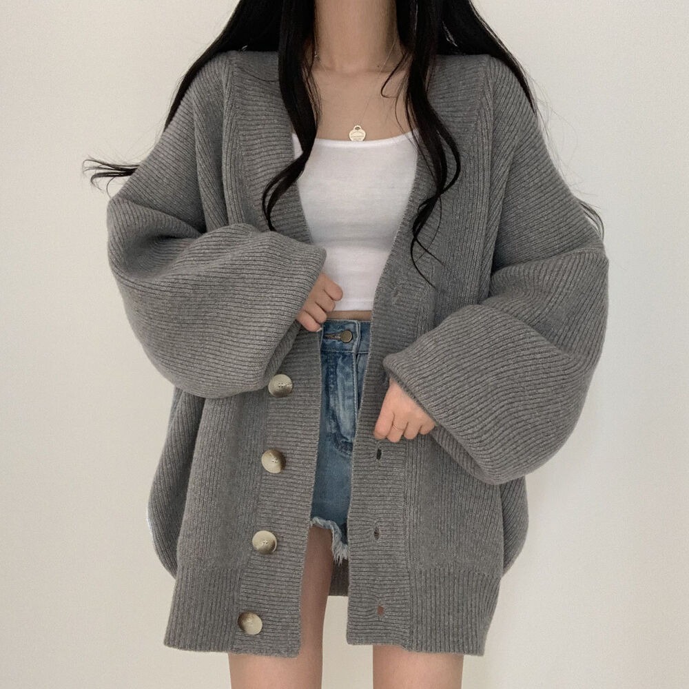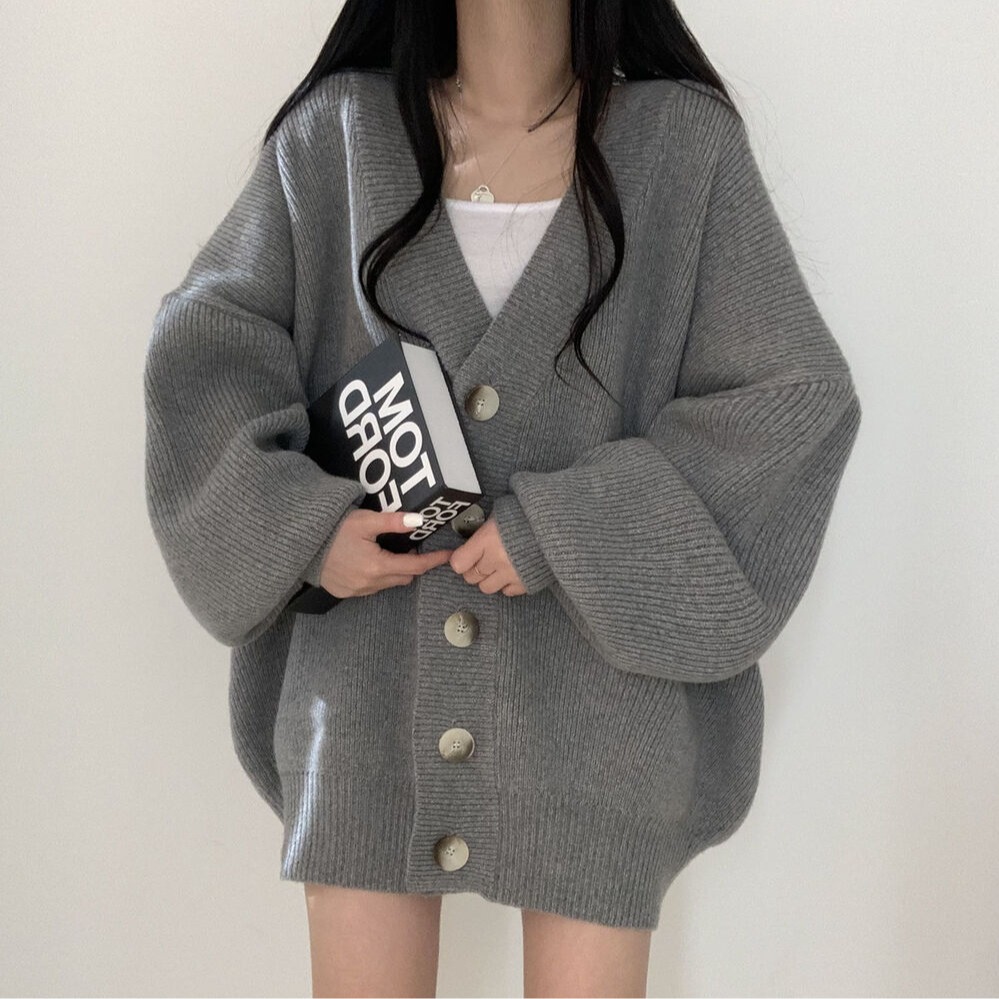 2025秋冬简约纯色慵懒宽松休闲百搭中长款毛衣外套女针织开衫