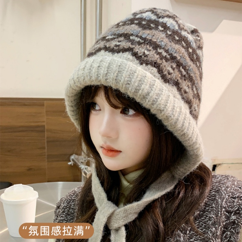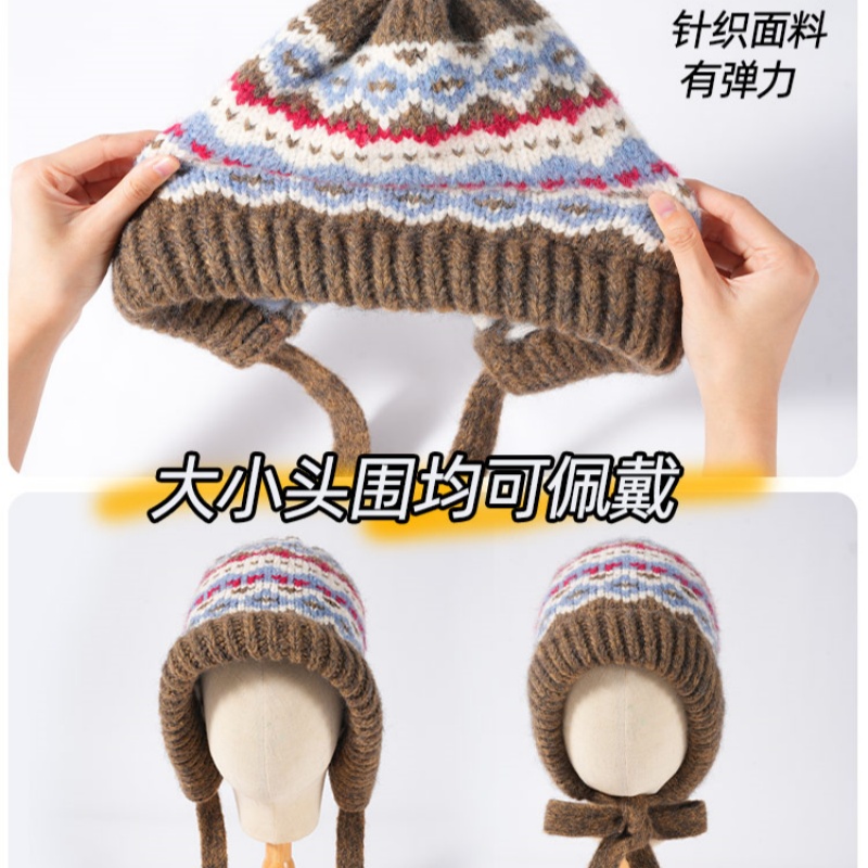 费尔岛风针织帽女冬季保暖巴拉克拉法秋冬帽子冬天堆堆毛绒毛线帽