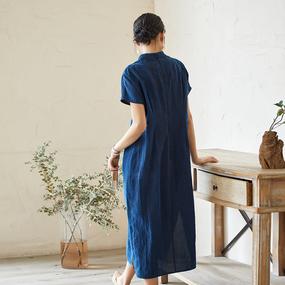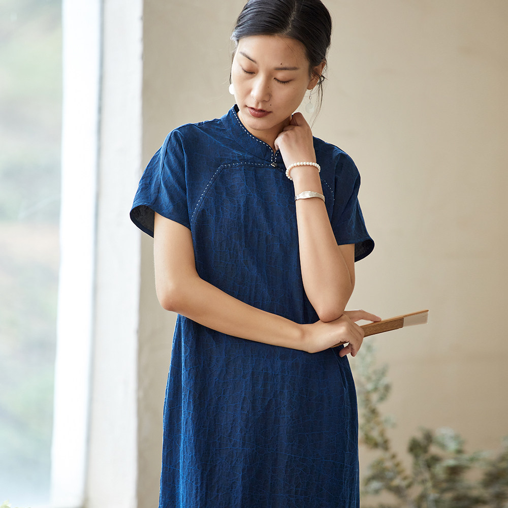 布小匠原创设计蓝龟纹香云纱桑蚕丝连肩袖旗袍女新中式国风连衣裙