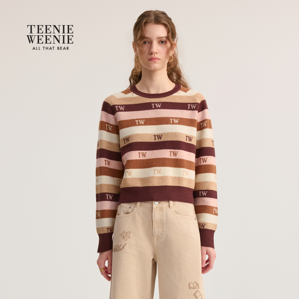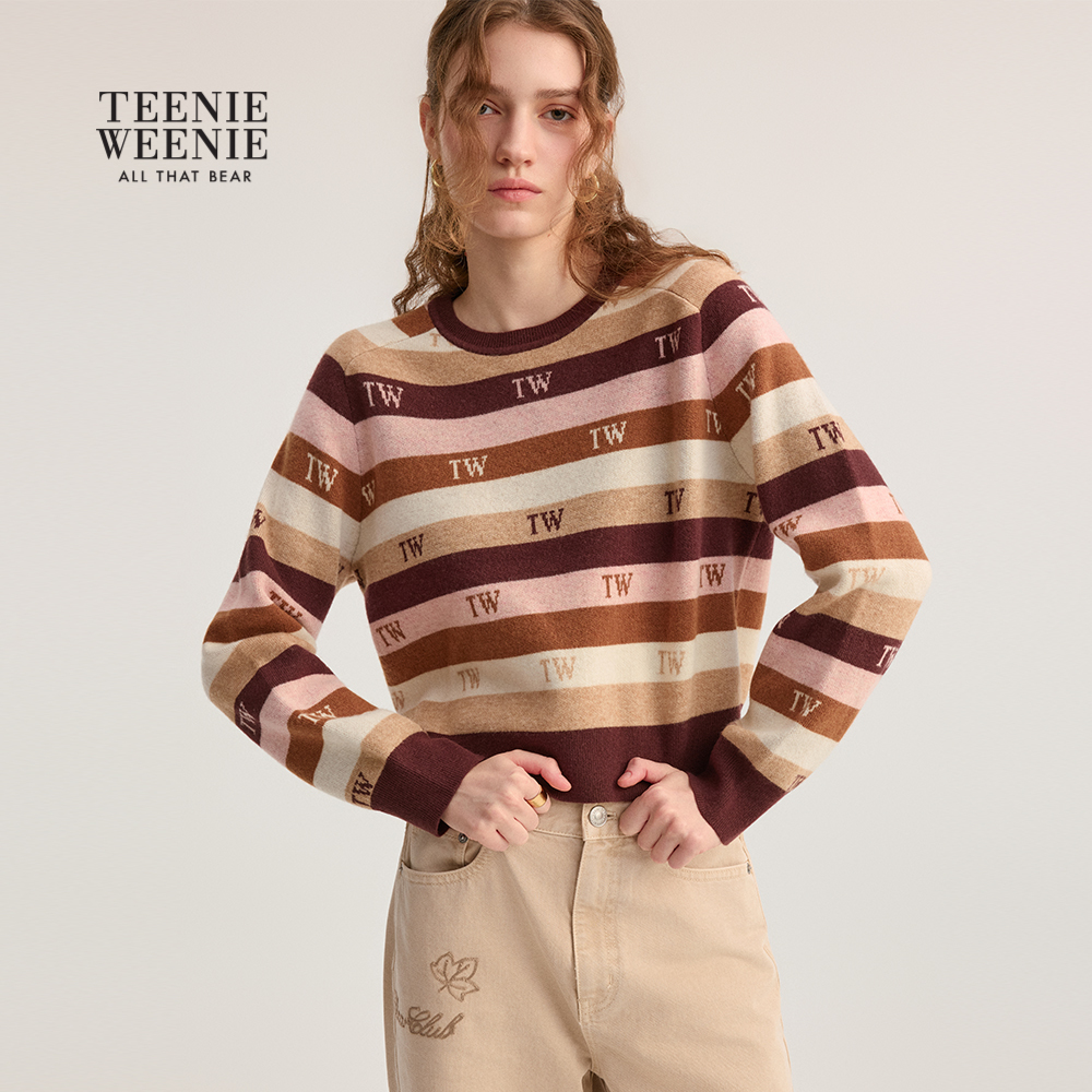 TeenieWeenie小熊女装毛针织衫2025秋季新款字母提花条纹圆领套衫