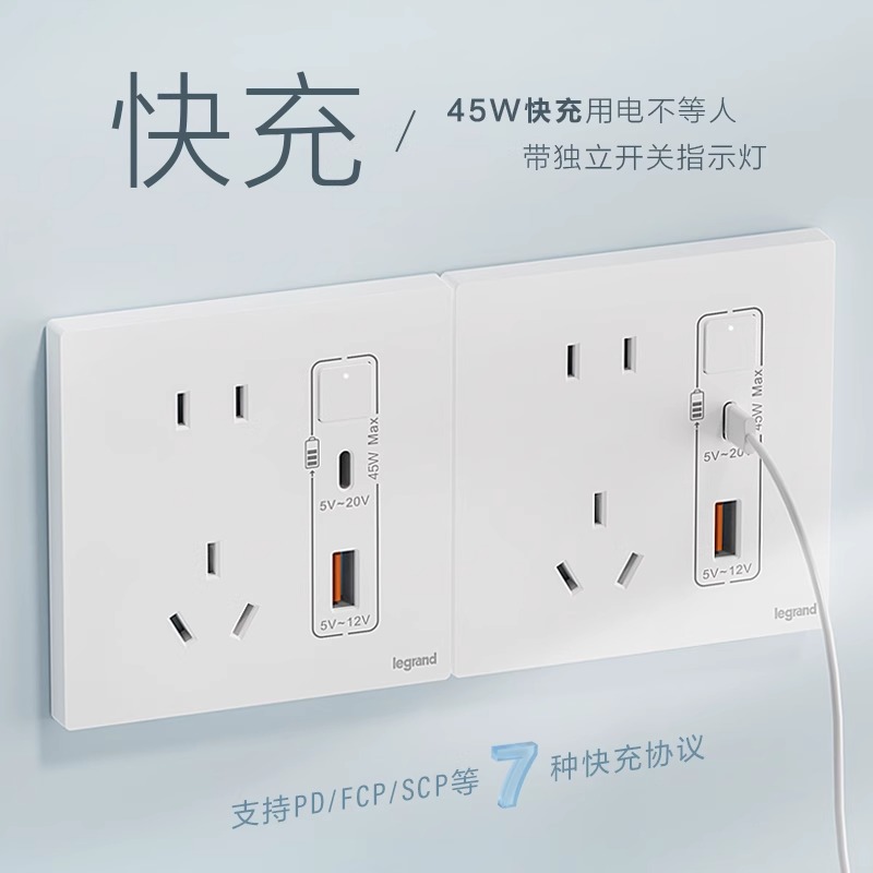 罗格朗86型带五孔usb手机充电插座TypeA+C快充USB陶瓷白色45W暗装