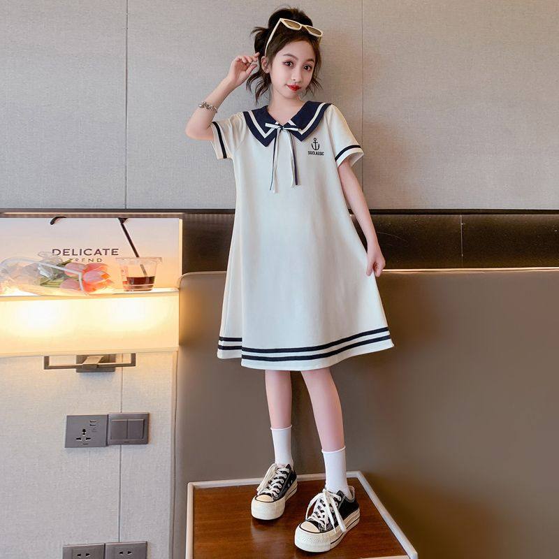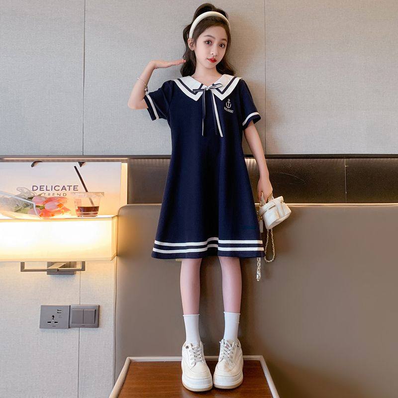 女孩子裙子夏季2025新款女大童装洋气显瘦学院风海军领学生连衣裙