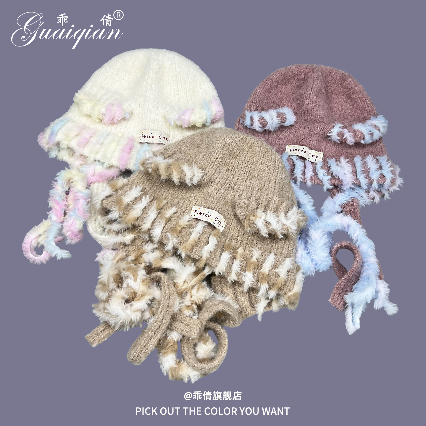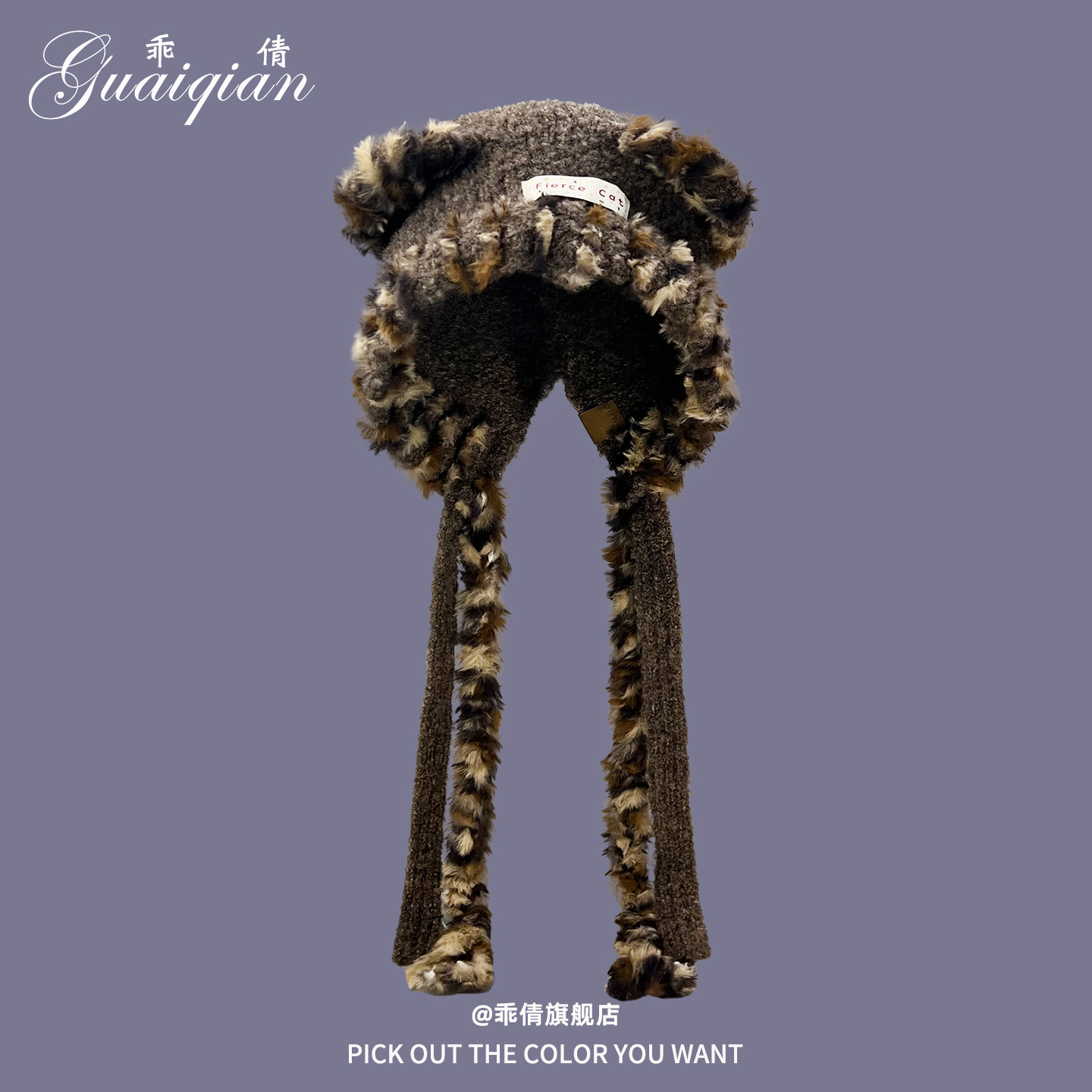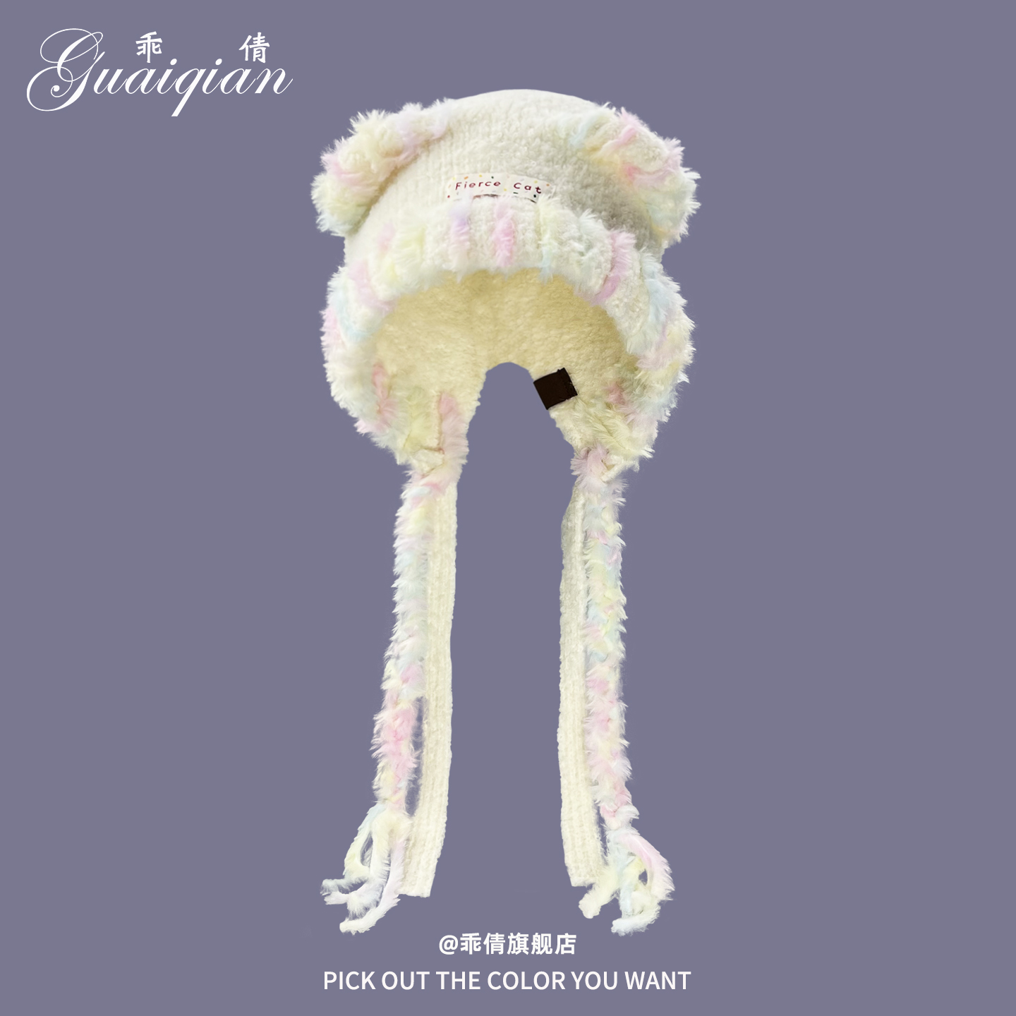 多巴胺可爱猫耳朵毛线帽子女秋冬季保暖毛绒护耳针织帽辫子包头帽