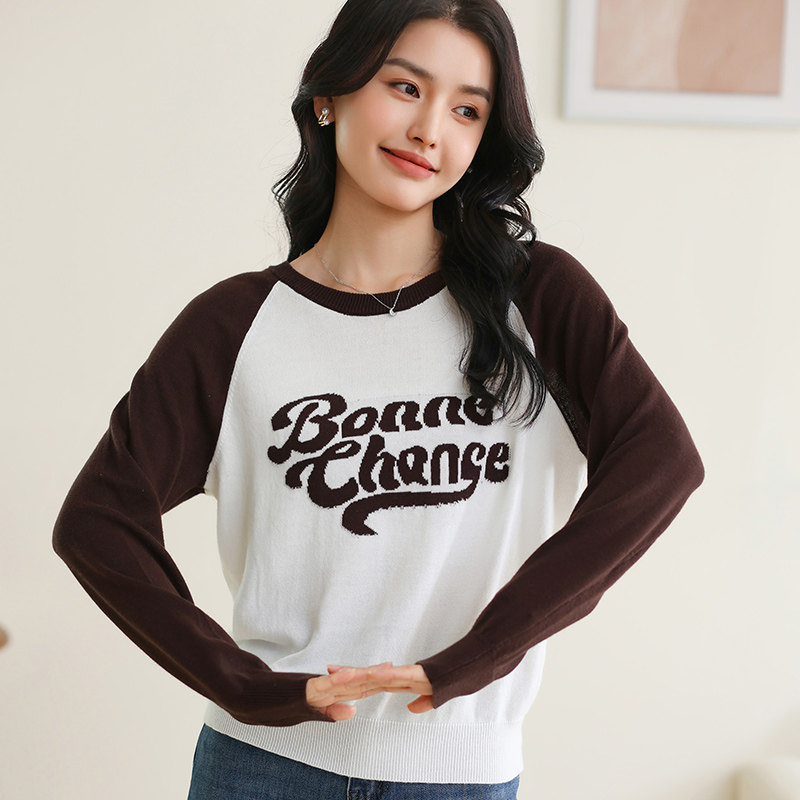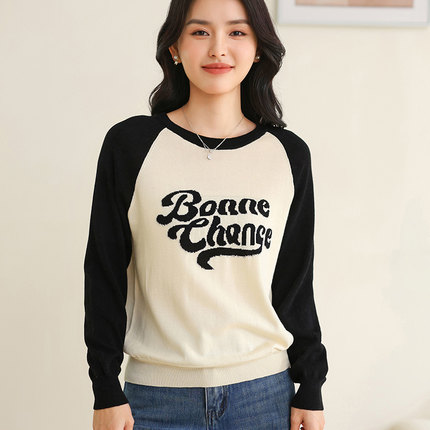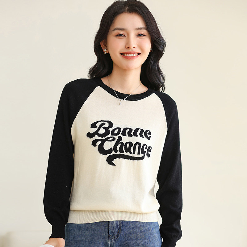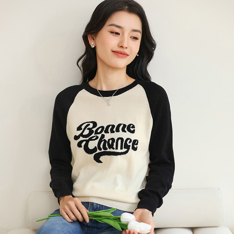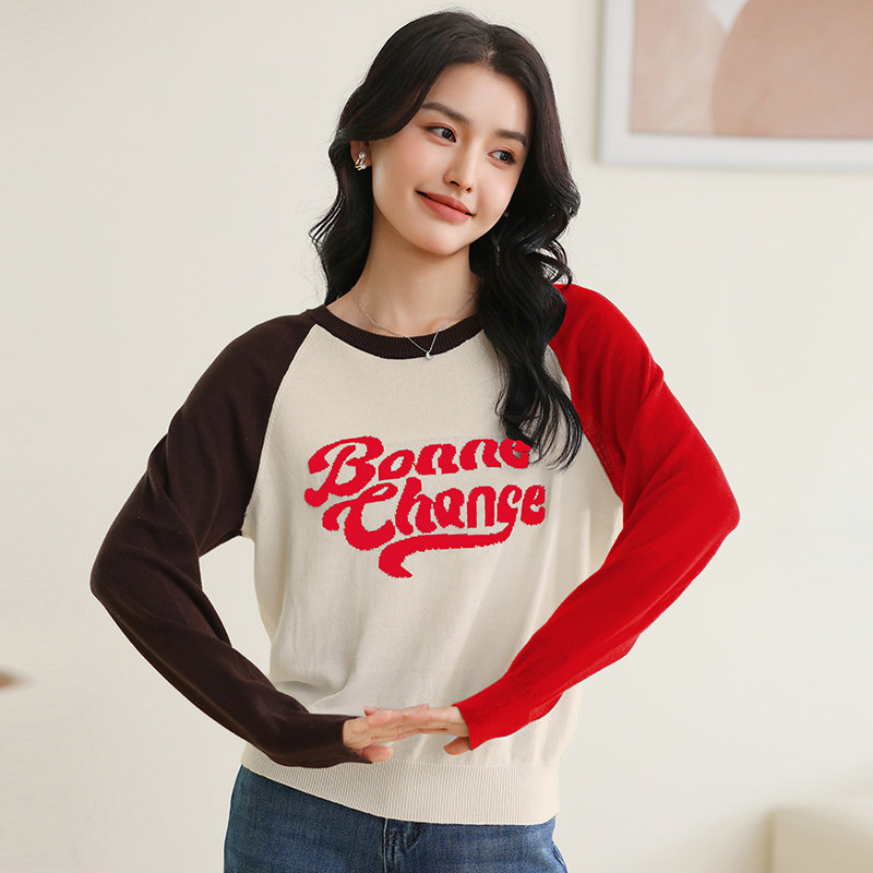 新款圆领纯棉复古字母提花插肩长袖短款撞色宽松毛衣女针织打底衫