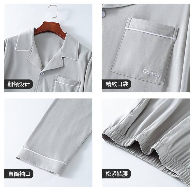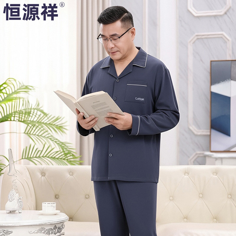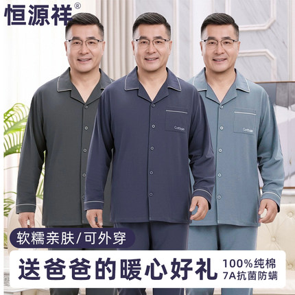 恒源祥纯棉睡衣男四季款中老年爸爸翻领全棉抗菌透气可外穿家居服