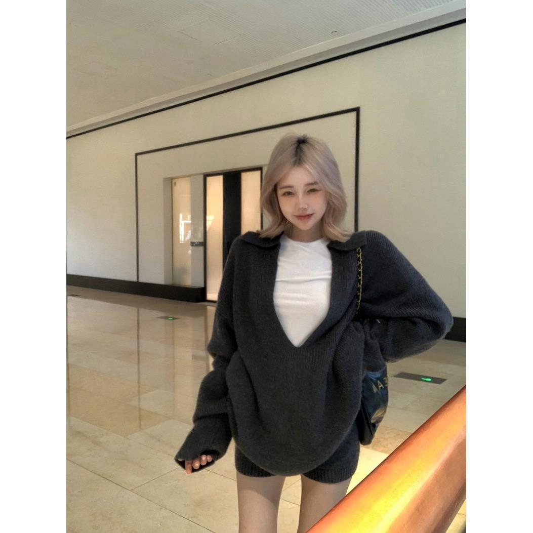 春秋2025新款松弛感慵懒风百搭深灰色大V领针织毛衣短裤两件套女