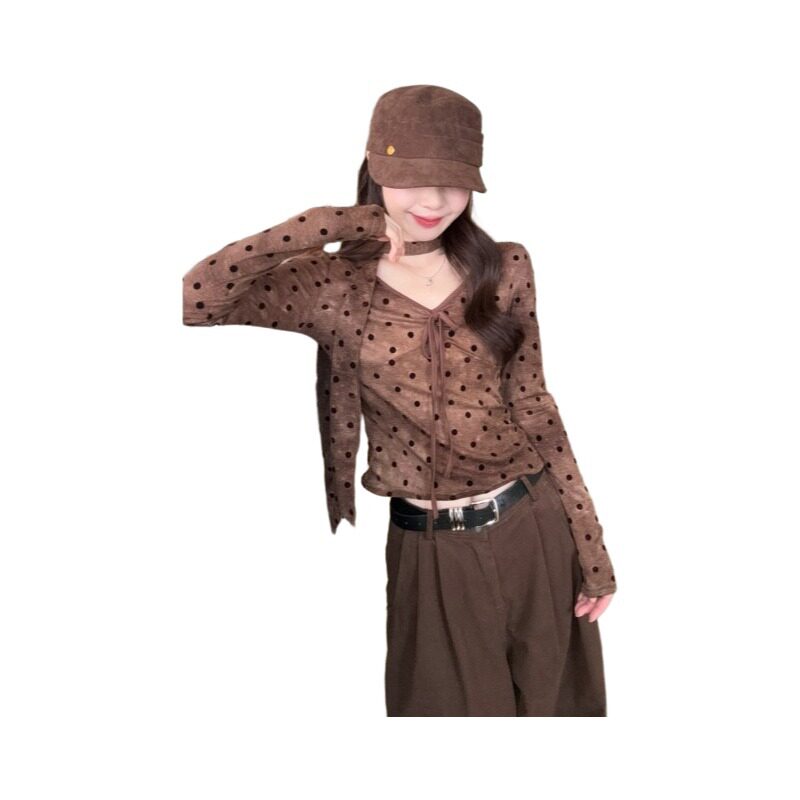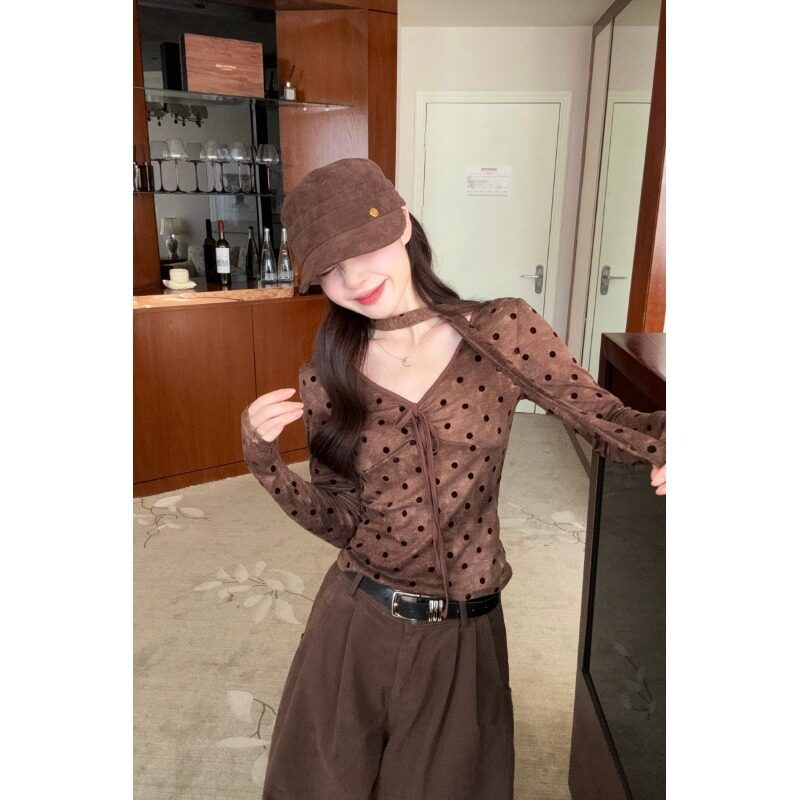 大码复古波点显瘦V领长袖T恤女秋季胖mm减龄时尚气质修身辣妹上衣