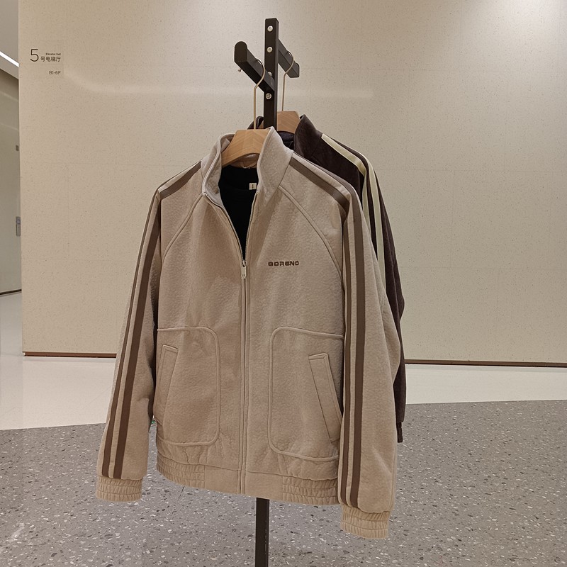 男装外套立领高端皮绒条纹夹克秋冬2025新款潮牌时尚机车服上衣服