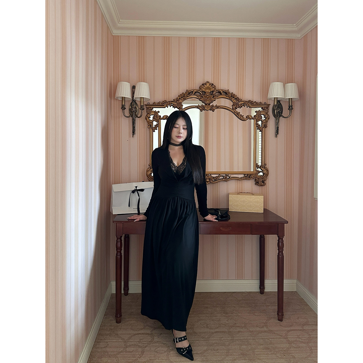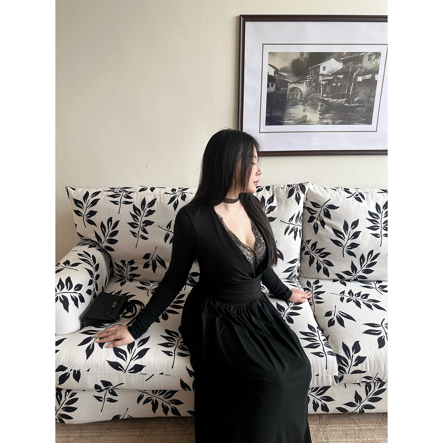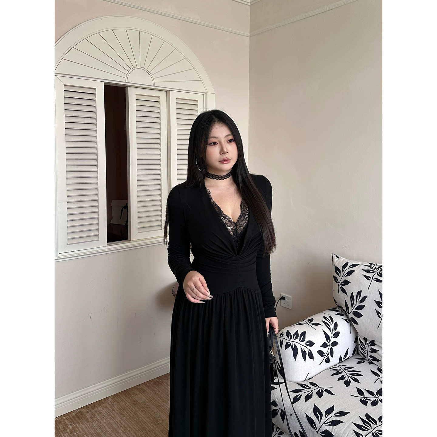 大小姐微胖大码“韩漫女主”纯欲性感蕾丝V领长袖修身收腰连衣裙