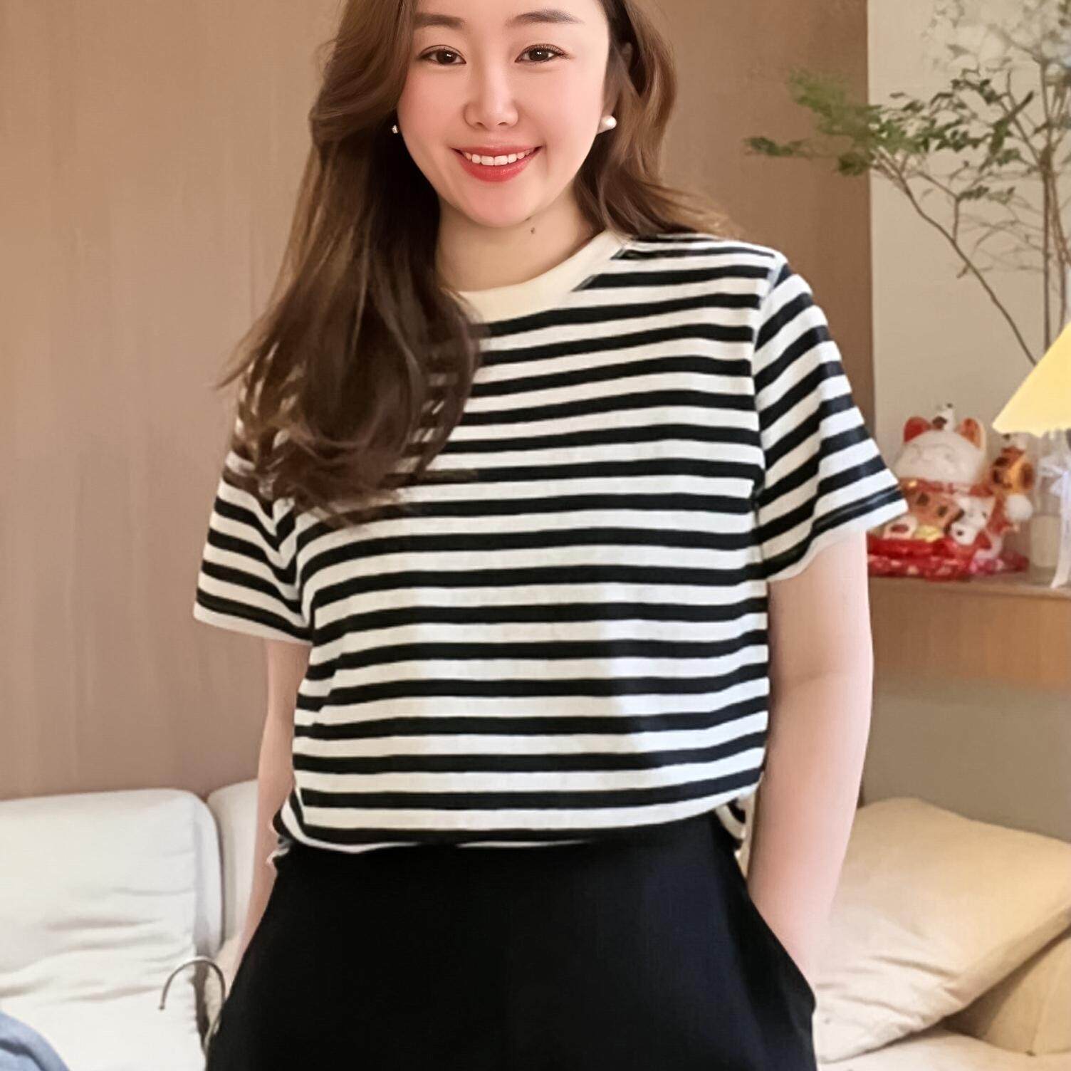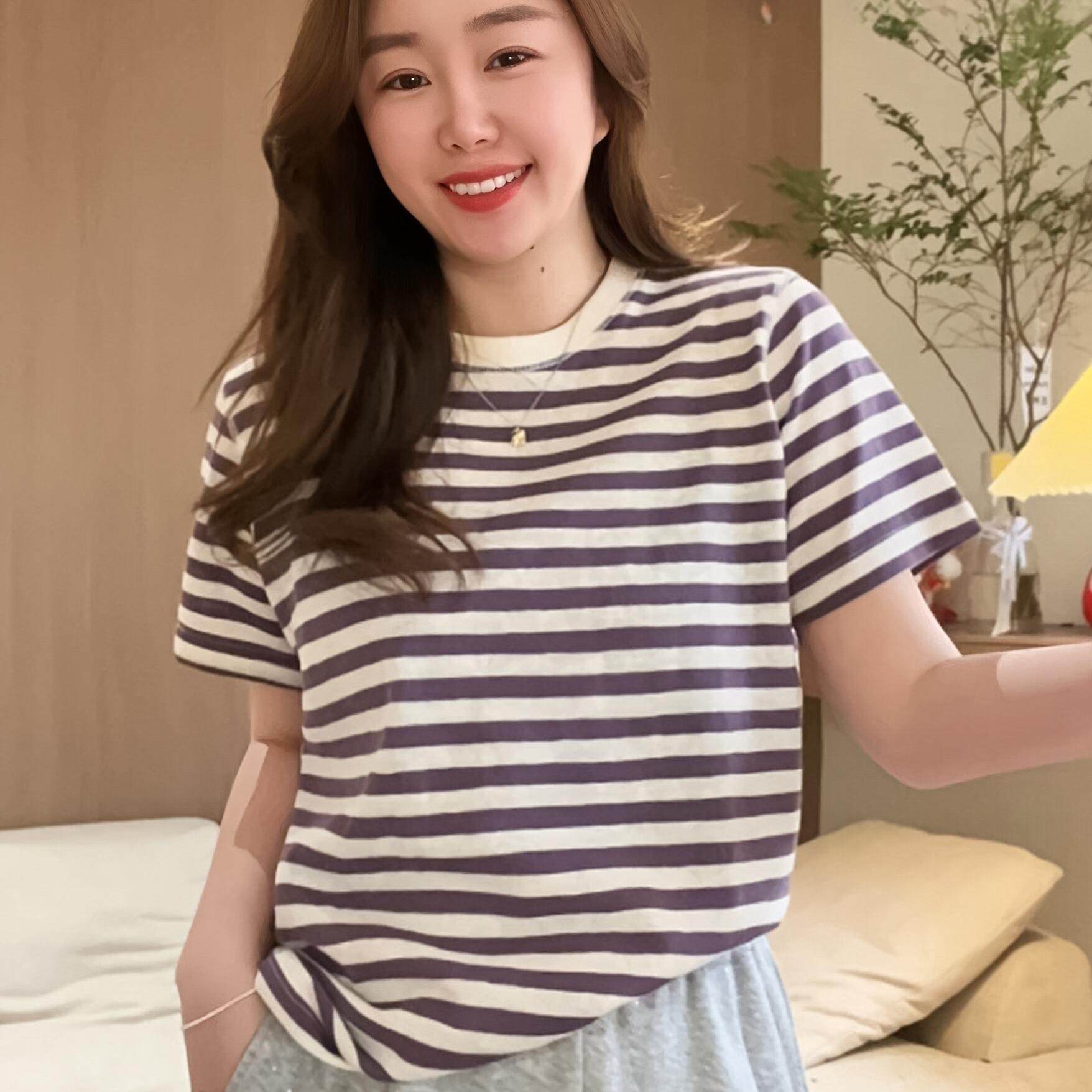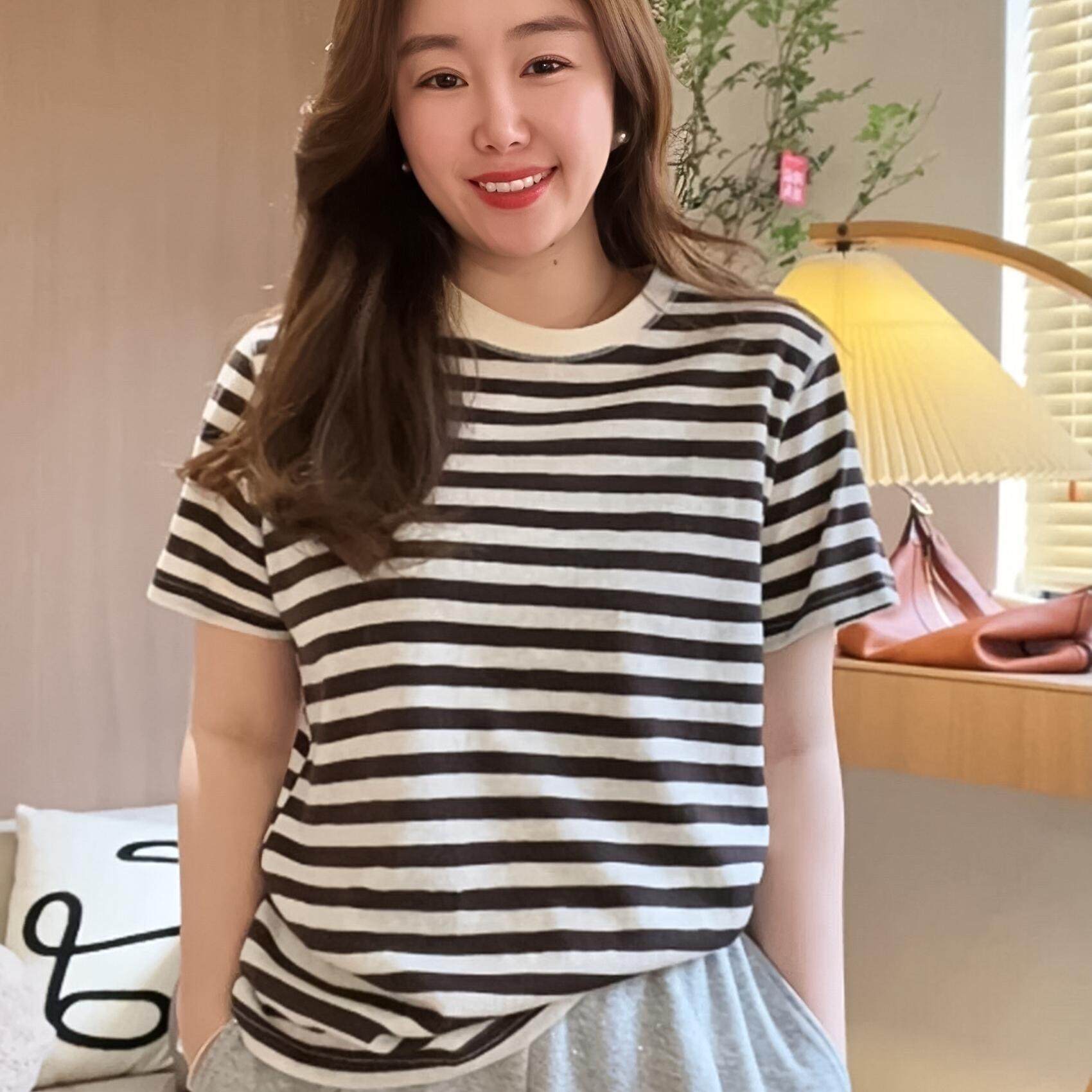 圆领百搭条纹正肩短袖T恤上衣女