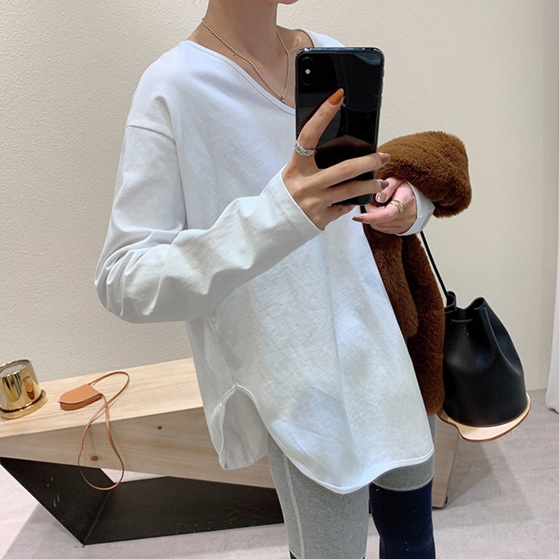 开叉长袖t恤女秋冬设计感小众宽松v领上衣2022新款白色打底衫内搭