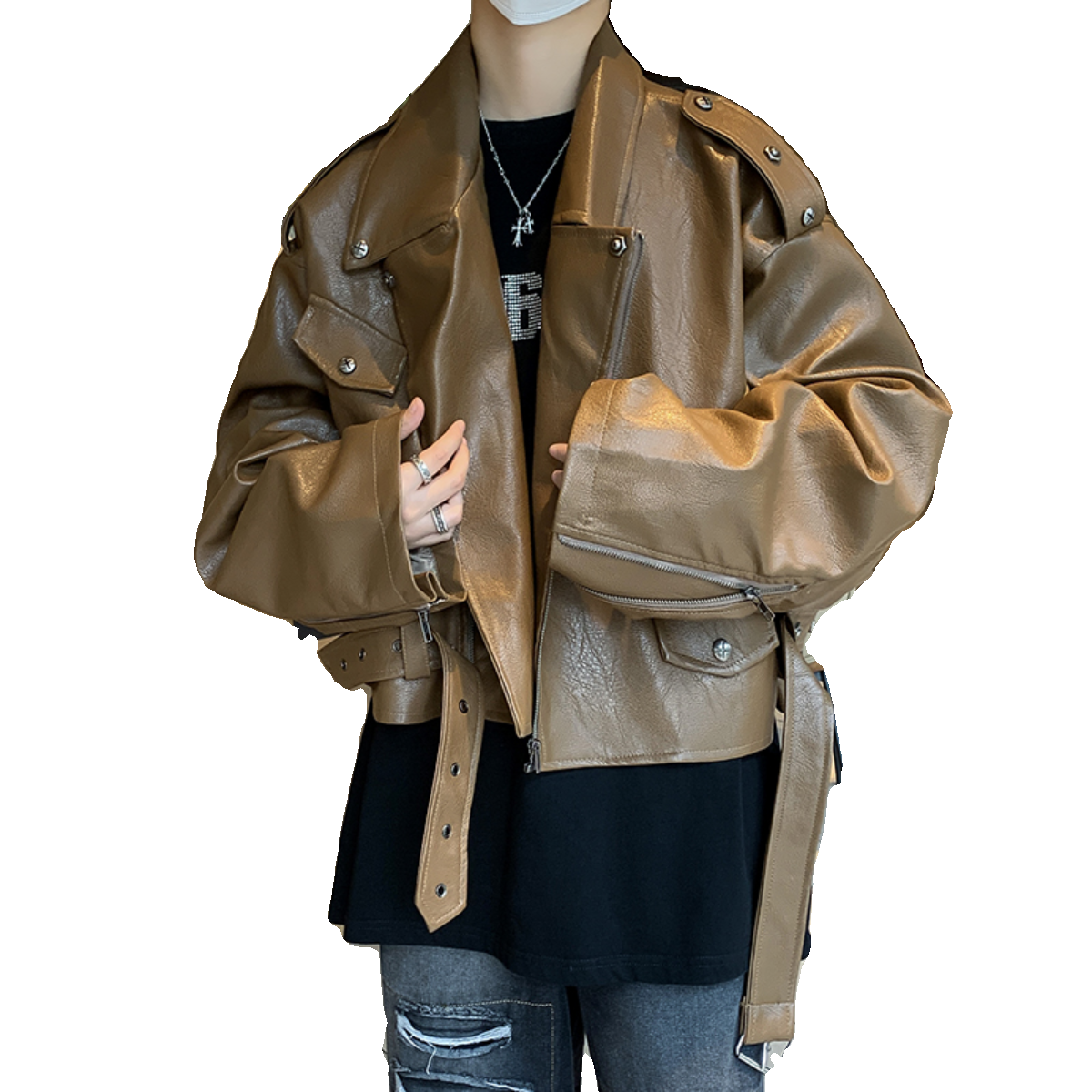 美式咖色铆钉皮衣外套男款国潮炸街设计高级感痞帅短款机车服夹克
