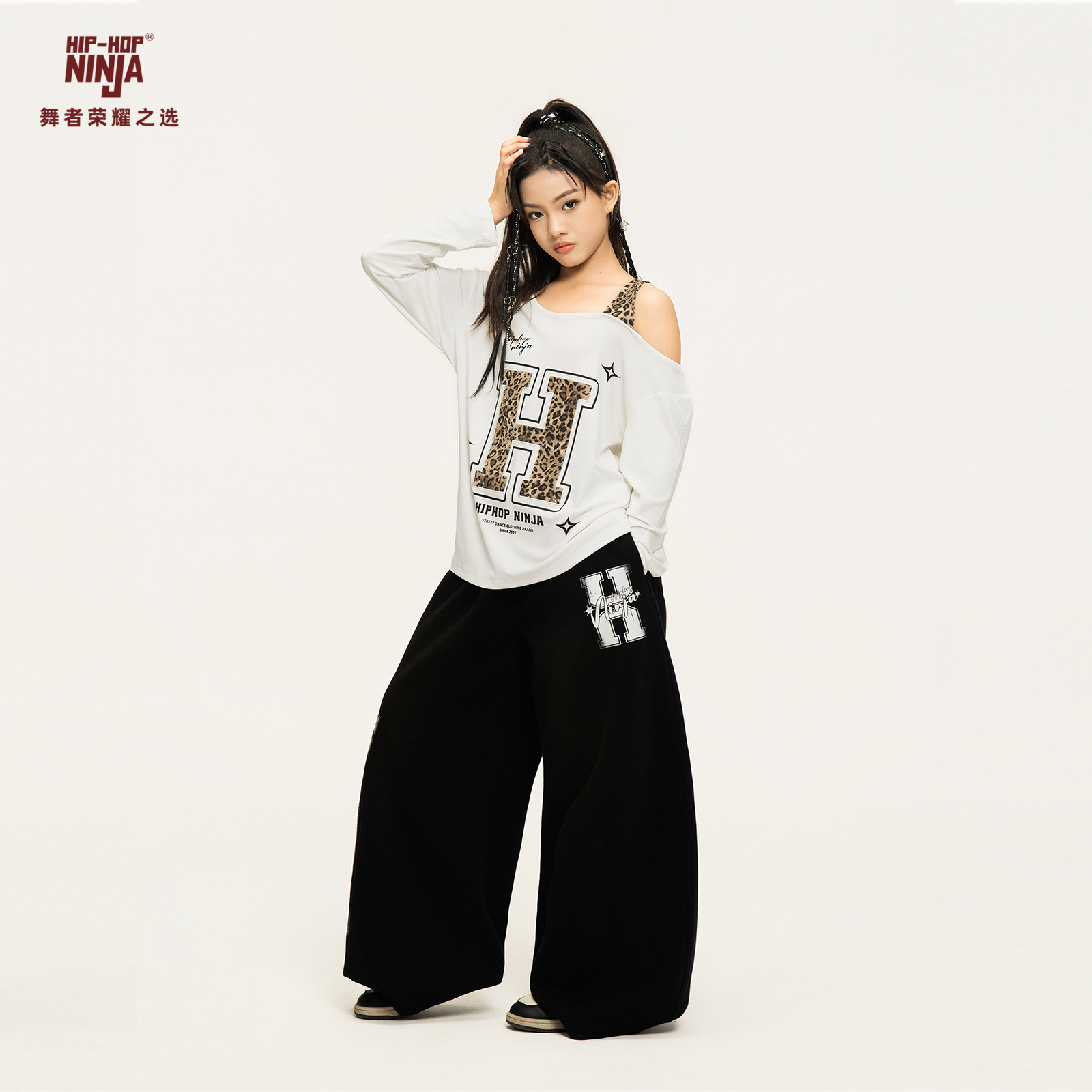 尼恩家女童爵士舞儿童街舞宽松运动裤豹纹斜肩长袖表演出服套装