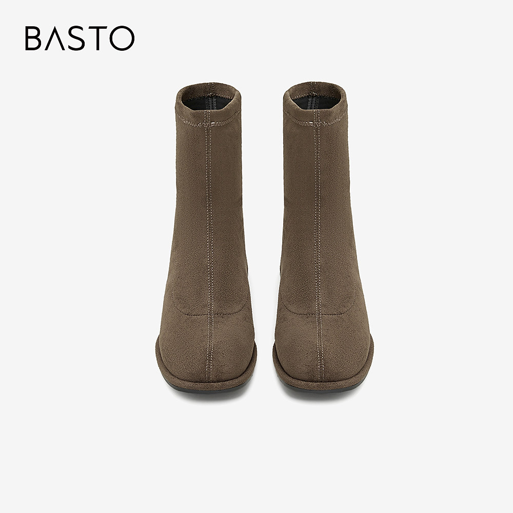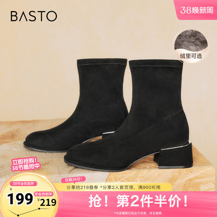 百思图冬季新款商场同款时尚潮流弹力靴粗跟女短靴E0283DD4