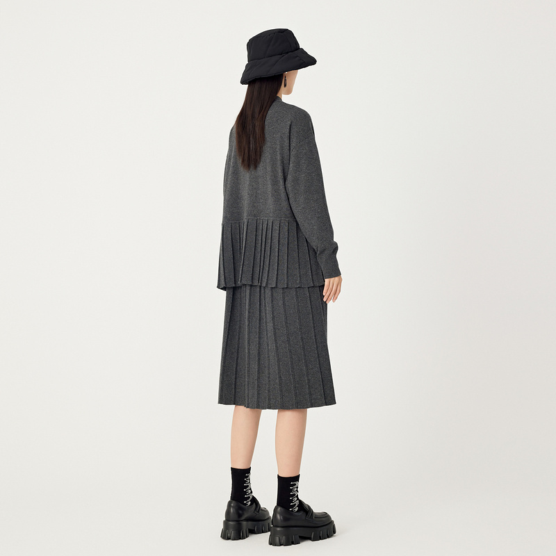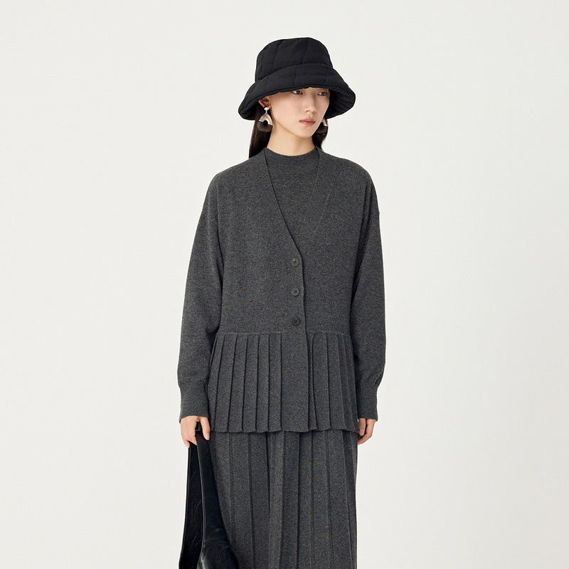 【会员价1968元】AUM噢姆冬季灰色文艺百褶下摆针织开衫宽松上衣