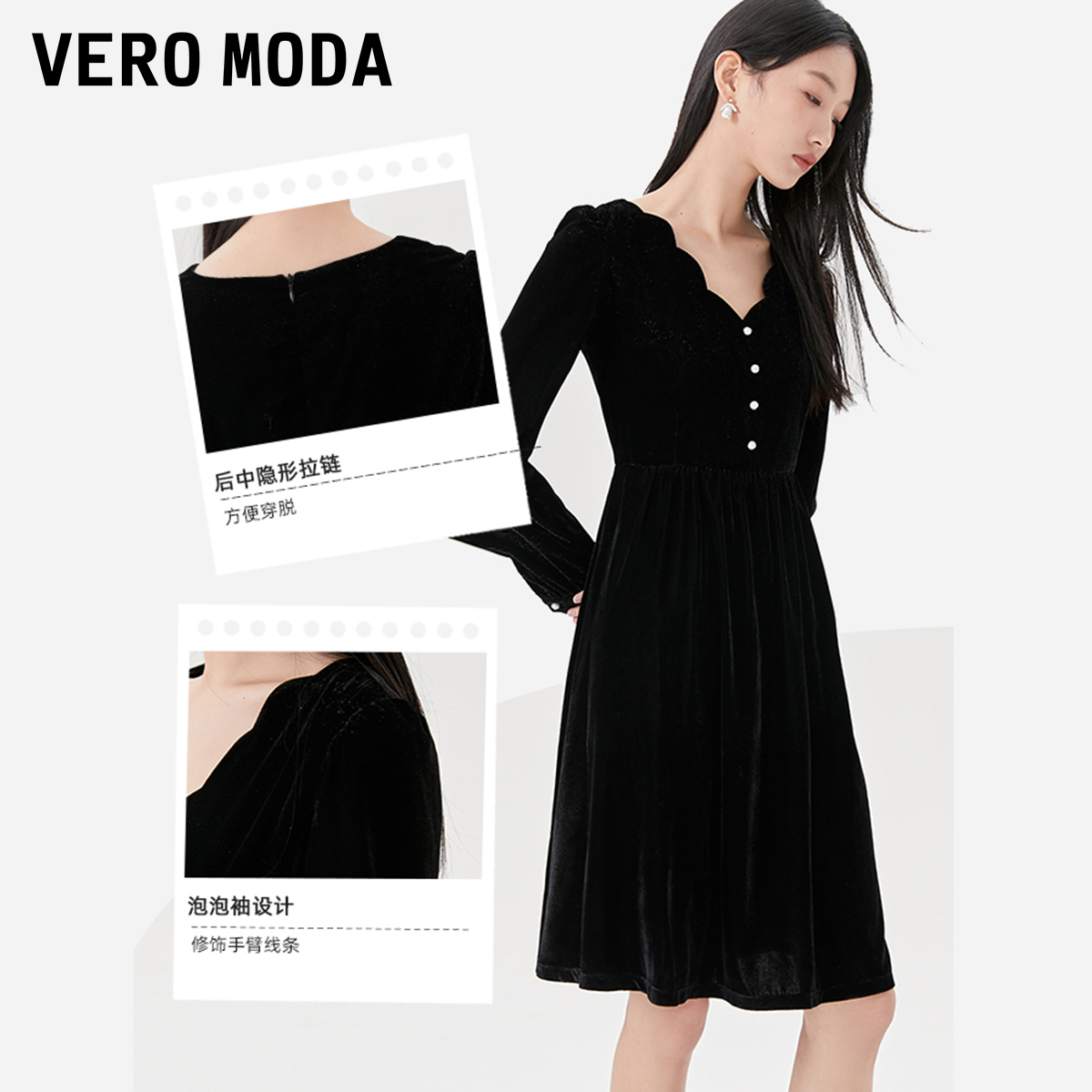 绫致VeroModa连衣裙2025丝绒中长裙泡泡袖V领收腰宫廷女时尚百搭