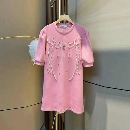 大码女装圆领钉珠亮钻短袖T恤裙胖MM法式甜美减龄洋气休闲连衣裙