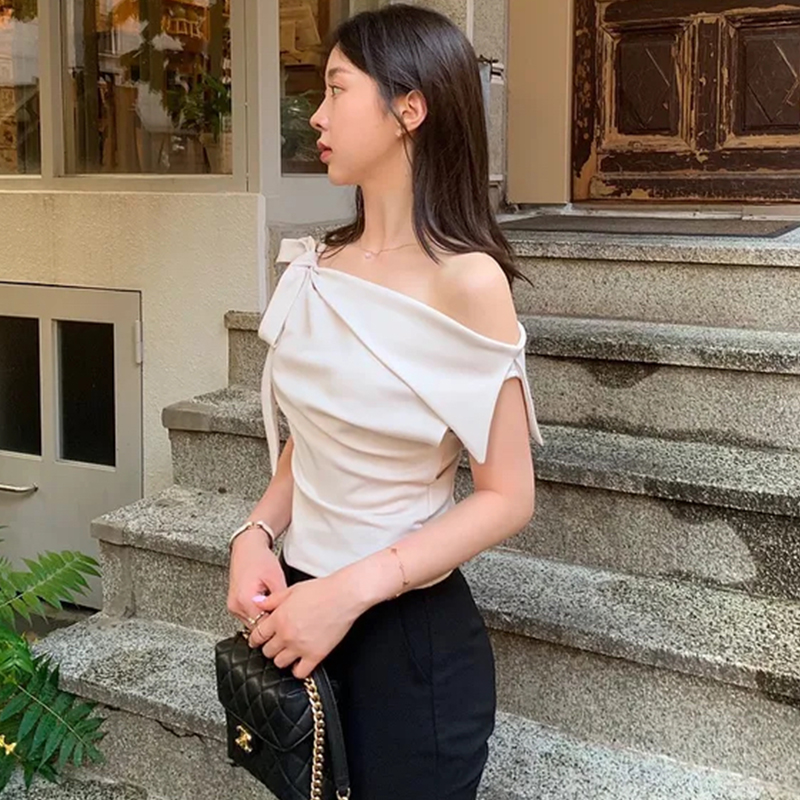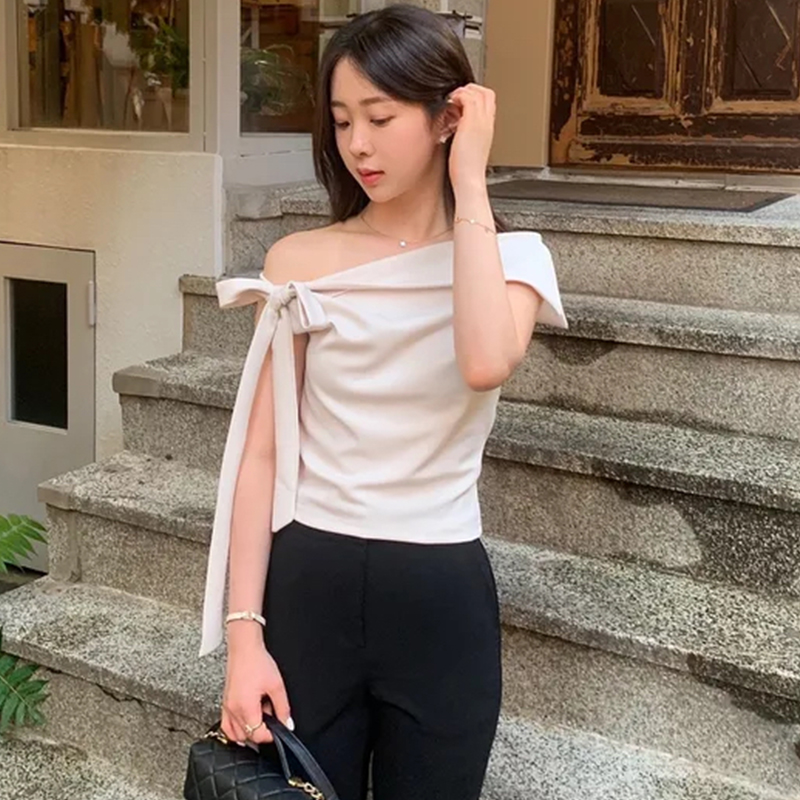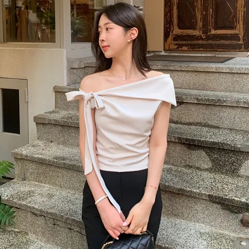 江南美人夏季气质斜肩绑带无袖上衣女新款露肩修身显瘦蝴蝶结t恤