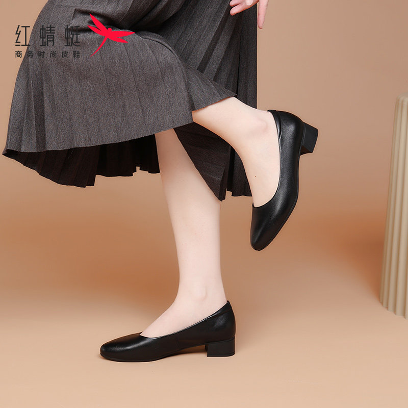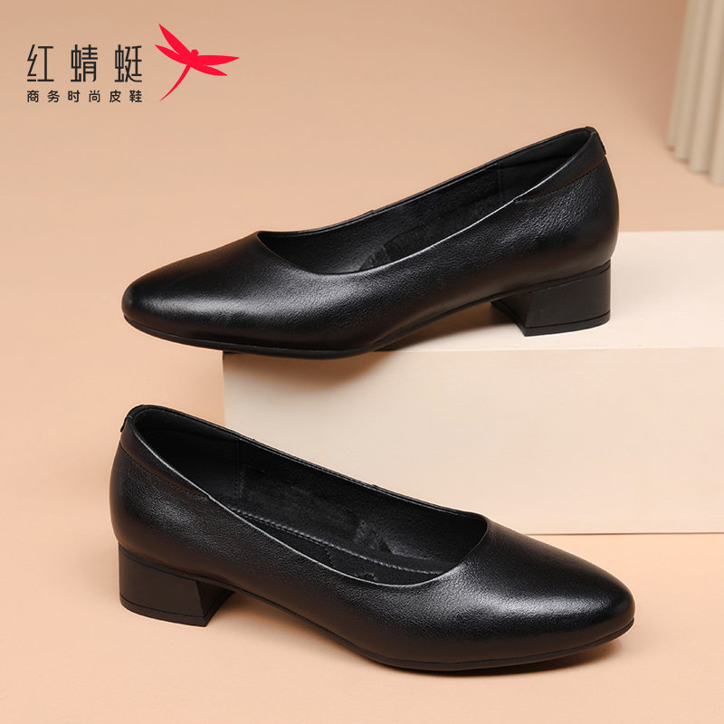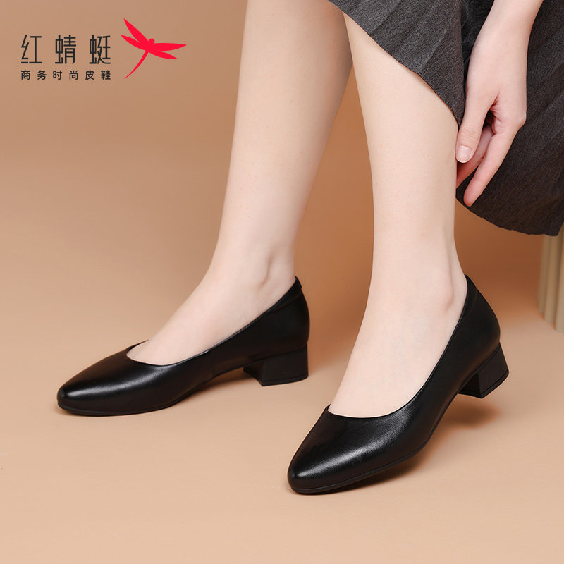 红蜻蜓一脚蹬女鞋春秋粗跟上班工作皮鞋高跟鞋女软底真皮夏季单鞋