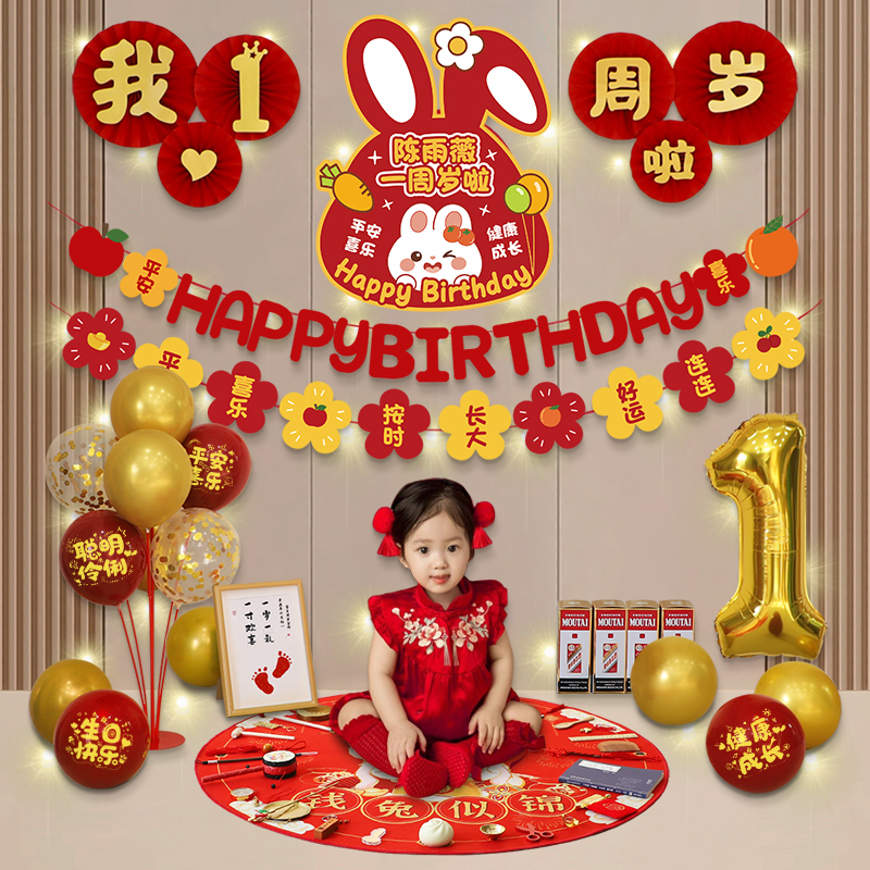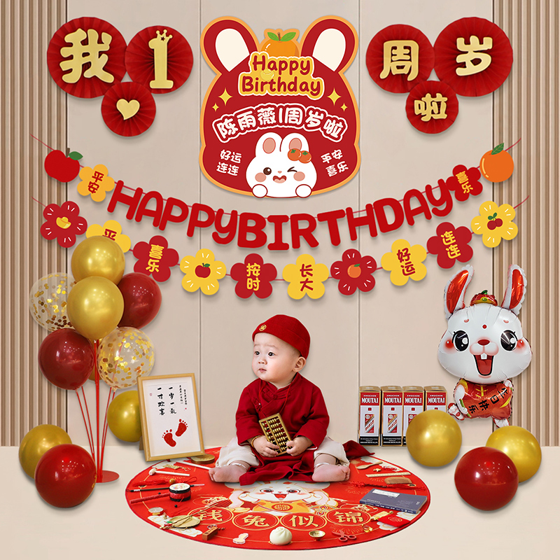 宝宝一周岁1岁生日场景装饰布置背景墙气球抓周礼仪式道具用品兔