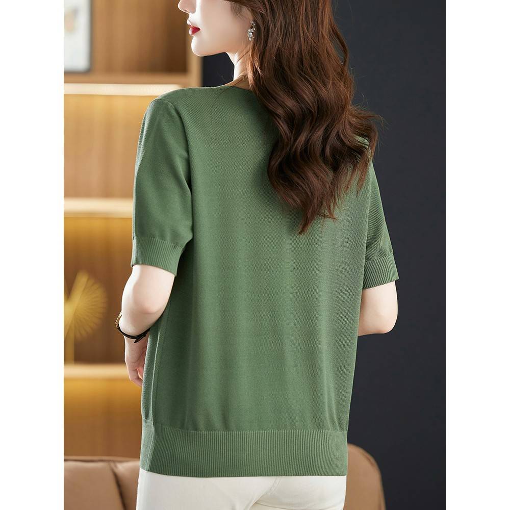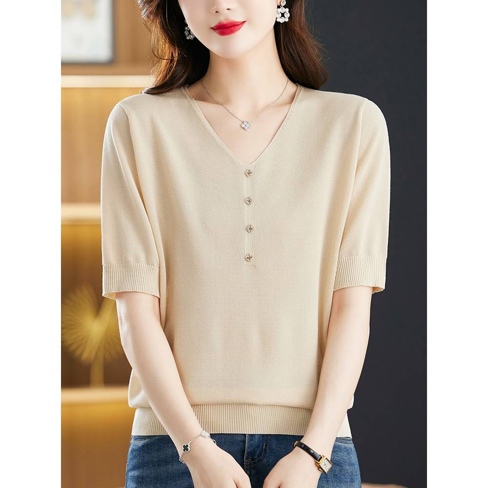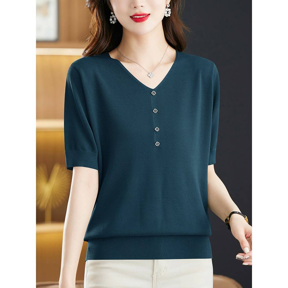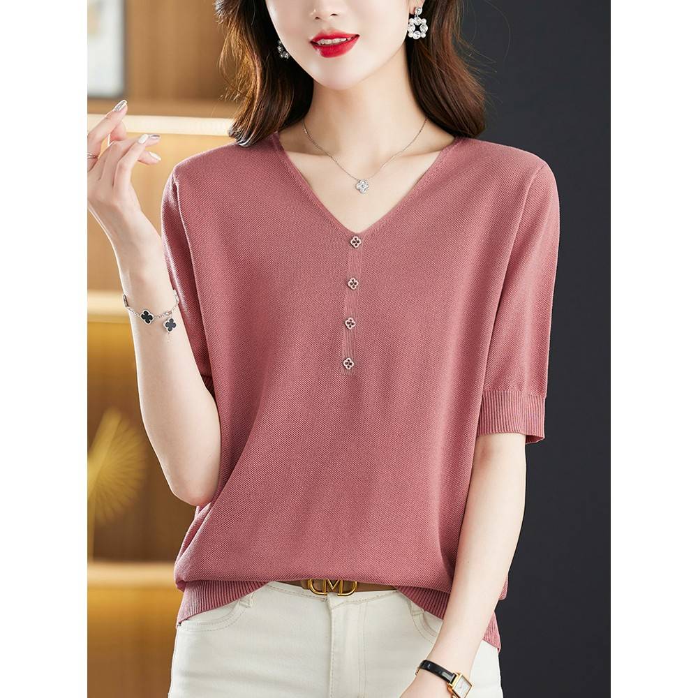 中年妈妈夏装冰丝短袖t恤宽松洋气V领上衣女士桑蚕丝体恤衫加大码