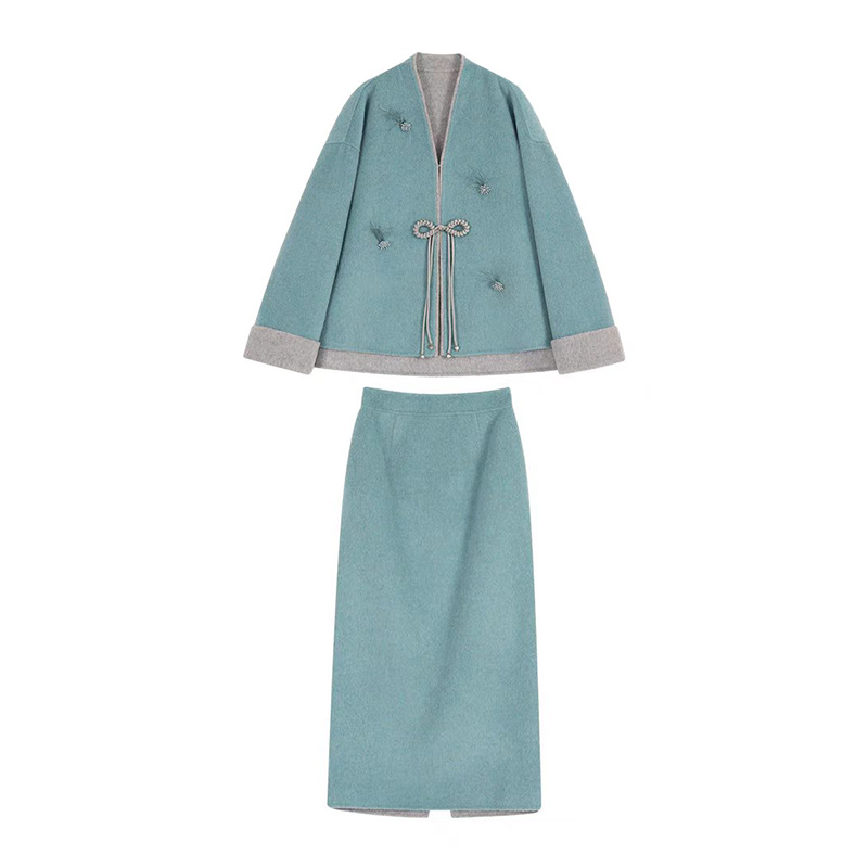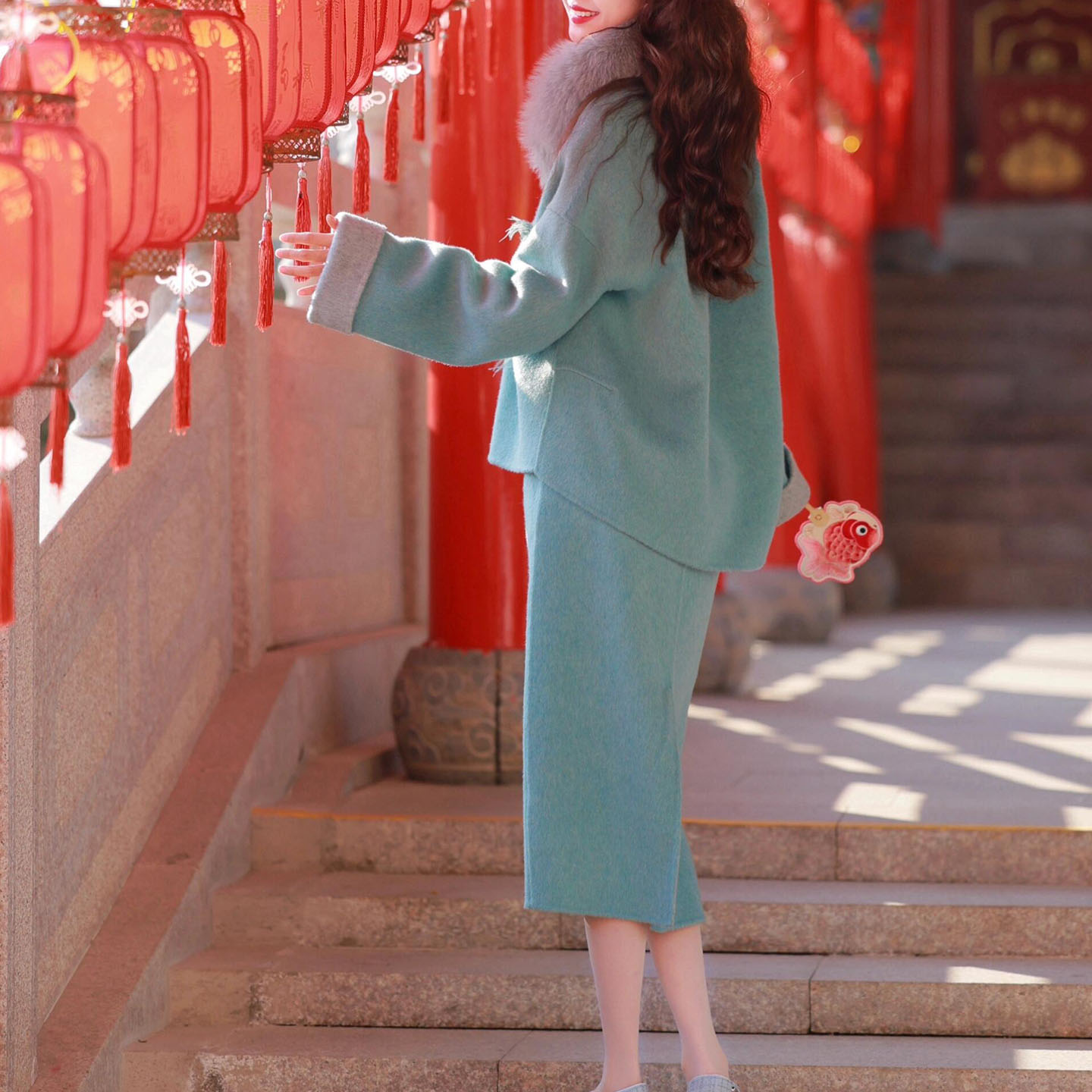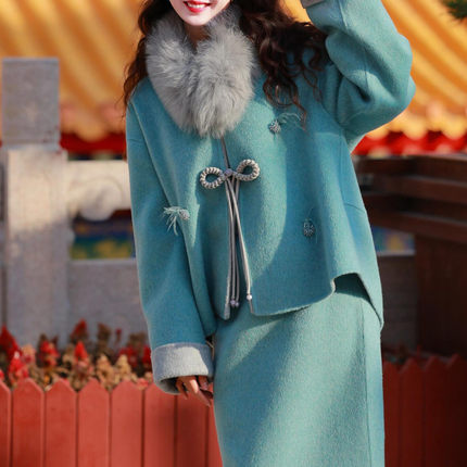 豪门太太真狐狸毛新中式澳洲羊绒套装冬季国风双面呢羊毛大衣外套